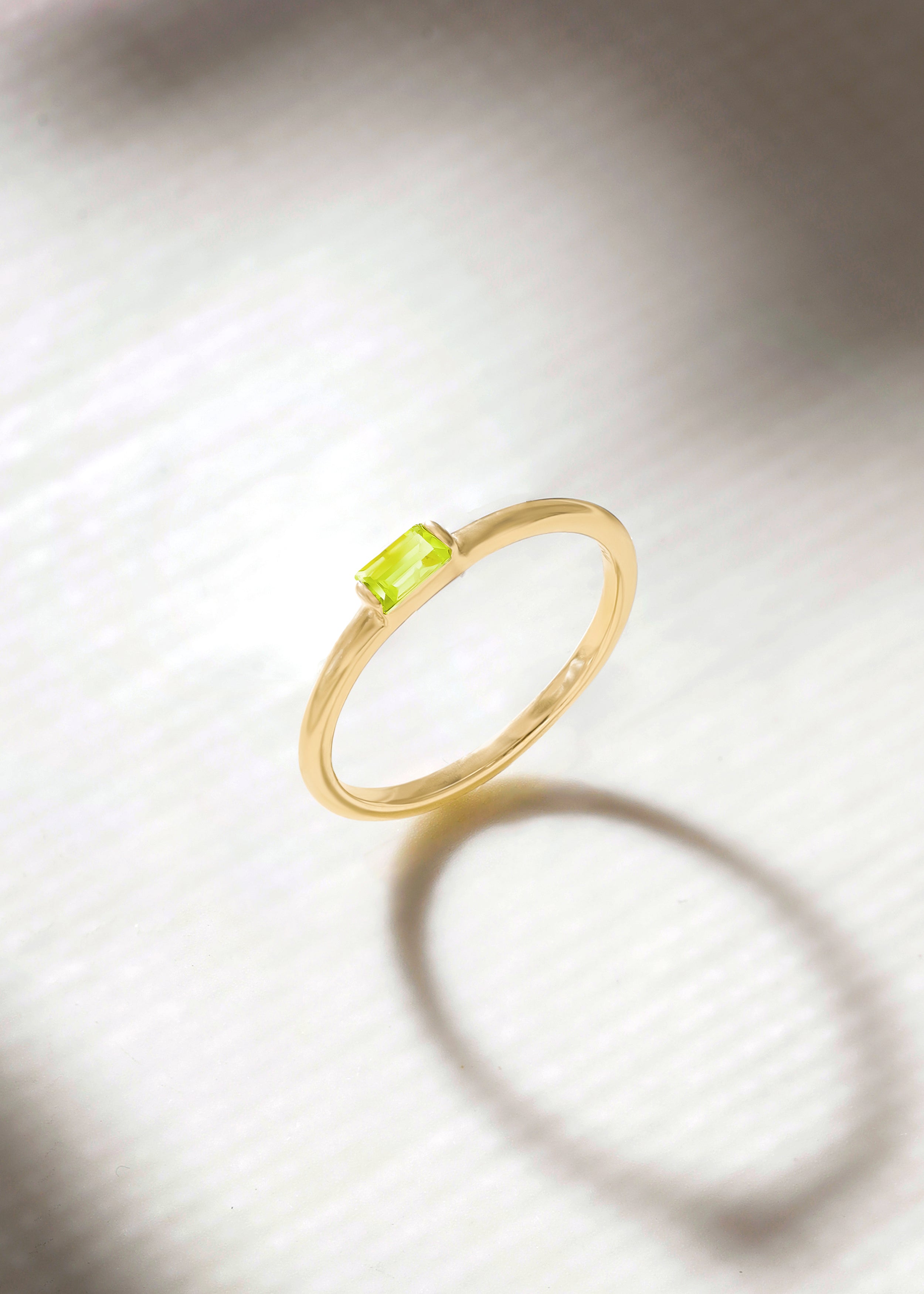 Fresh and refined, this ring showcases a radiant baguette-cut peridot at its center. The vibrant green hue brings a touch of natural elegance, while the slim, polished band keeps the design modern and effortless. Perfect for stacking or wearing solo, this ring adds a fresh pop of color to any look.