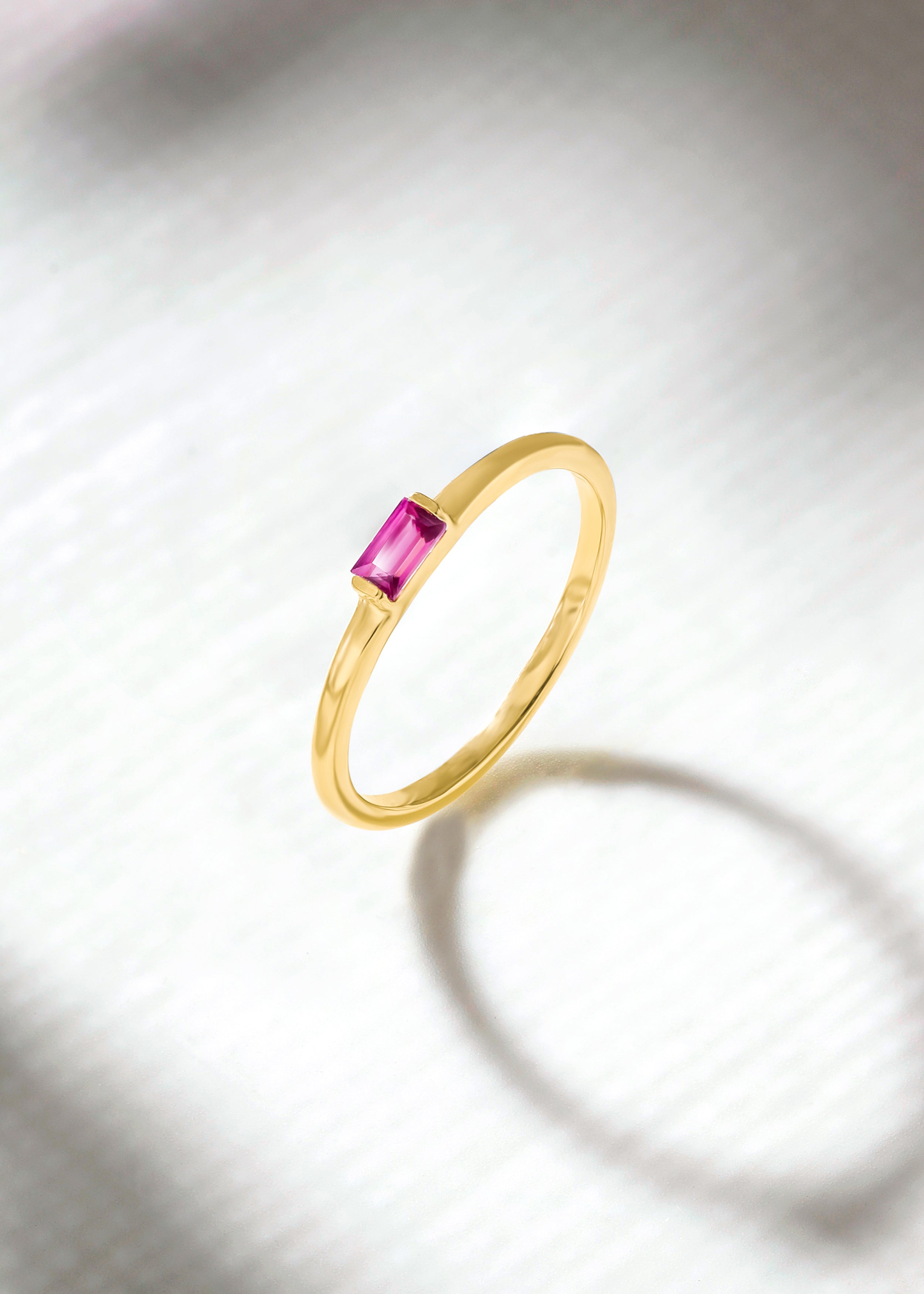 Delicate yet striking, this ring features a sleek baguette-cut rhodolite garnet at its center. The soft blush hue of the gemstone adds a romantic touch, while the slim polished band creates a modern, minimalist silhouette. Perfect for stacking or wearing solo, this ring brings effortless elegance to everyday style.