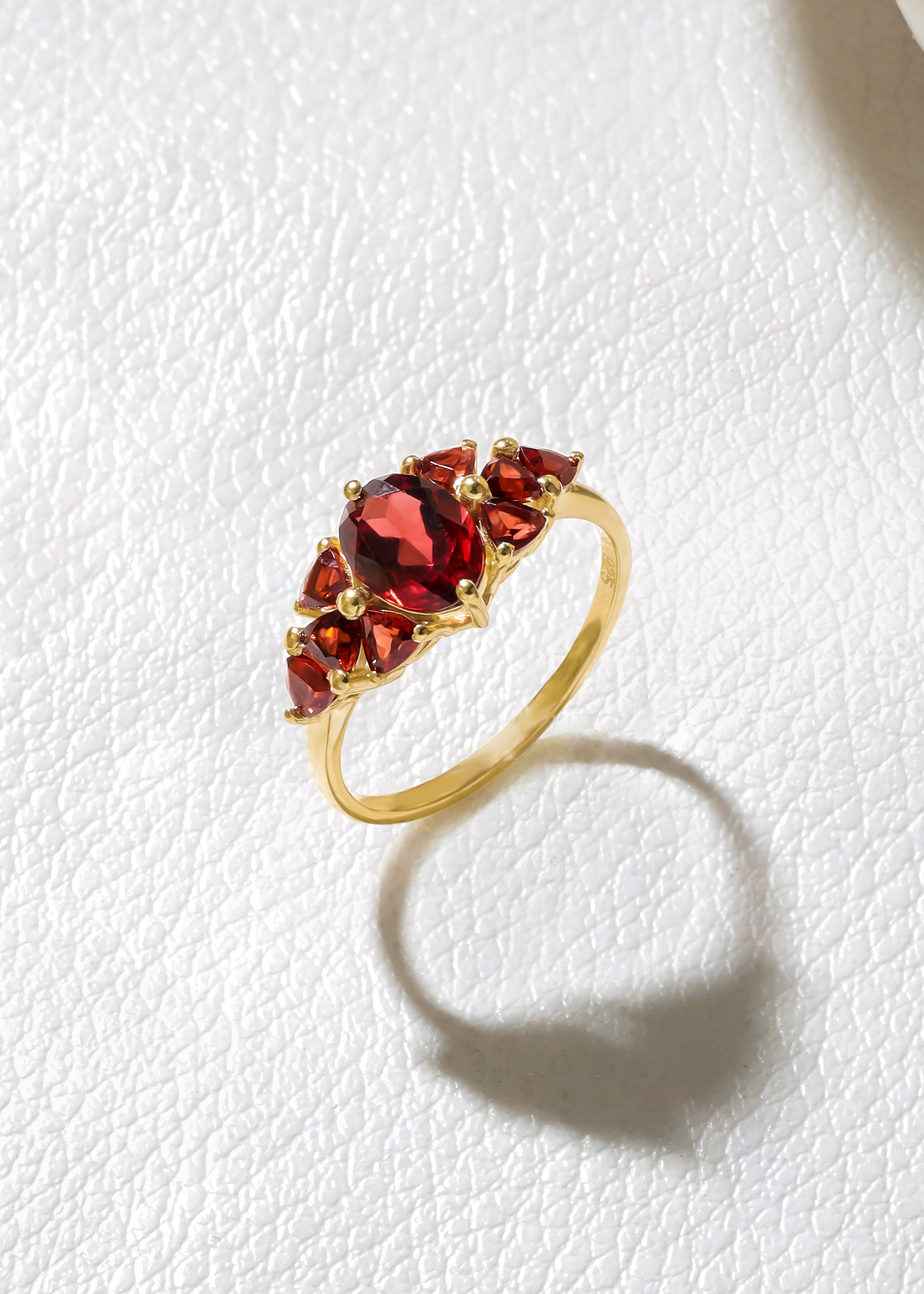 Elegant and timeless, this 14K Gold Plated 925 Sterling Silver Garnet Ring features a captivating oval-cut garnet at the center, flanked by sparkling side garnet stones. The rich red hues of the gemstones are beautifully complemented by the warm gold-plated finish, creating a refined yet striking design. Perfect for everyday sophistication or special occasions, this ring brings classic charm with a modern touch.