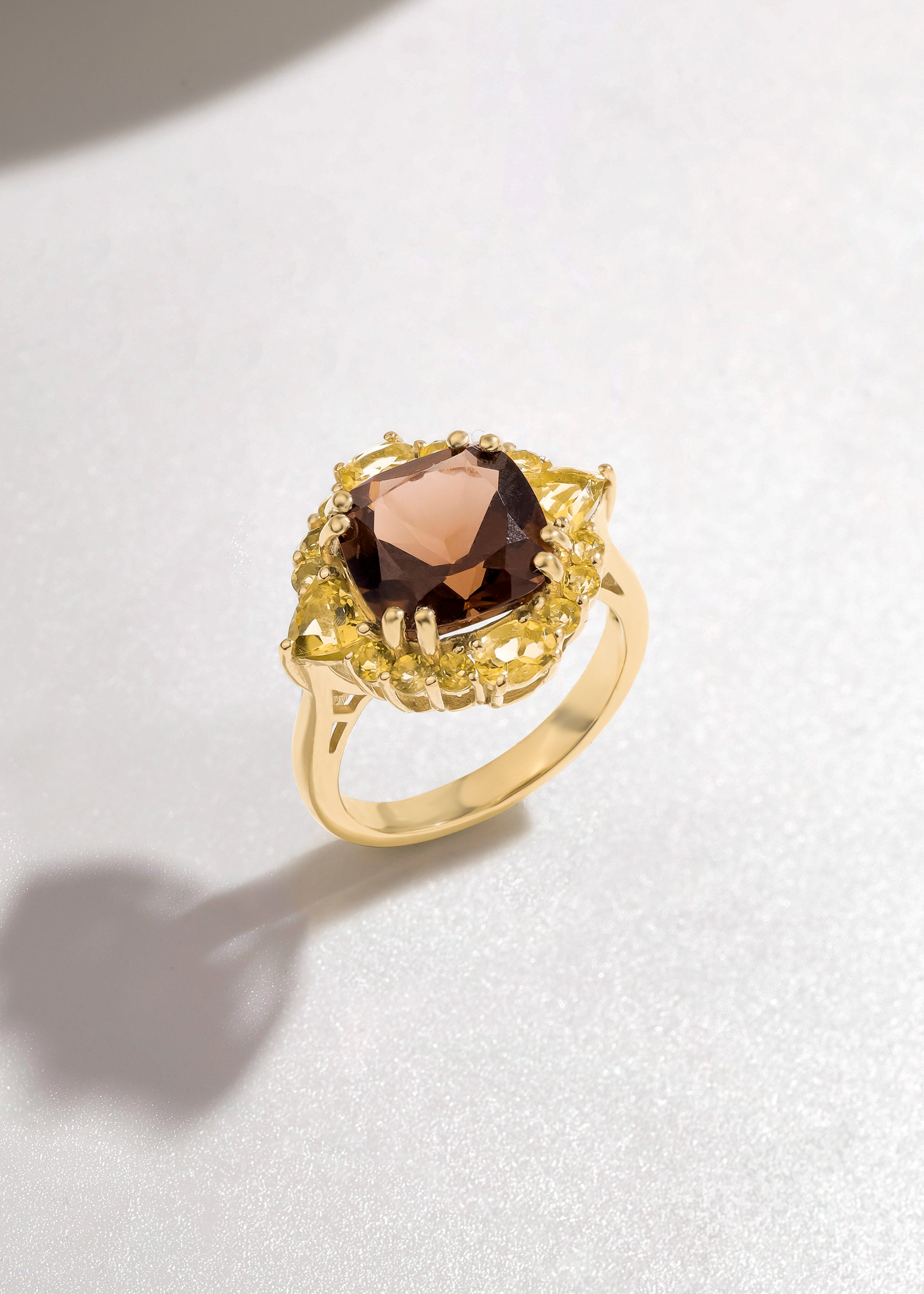 Warm and radiant, this 14K Gold Plated 925 Sterling Silver Statement Ring showcases a beautiful floral cluster design featuring smoky quartz and citrine gemstones. The rich, earthy tones of smoky quartz are perfectly balanced by the golden glow of citrine, creating a harmonious blend of depth and brilliance. Finished in a luxurious gold-plated setting, this ring is designed to make an elegant yet bold statement for special occasions or elevated everyday wear.