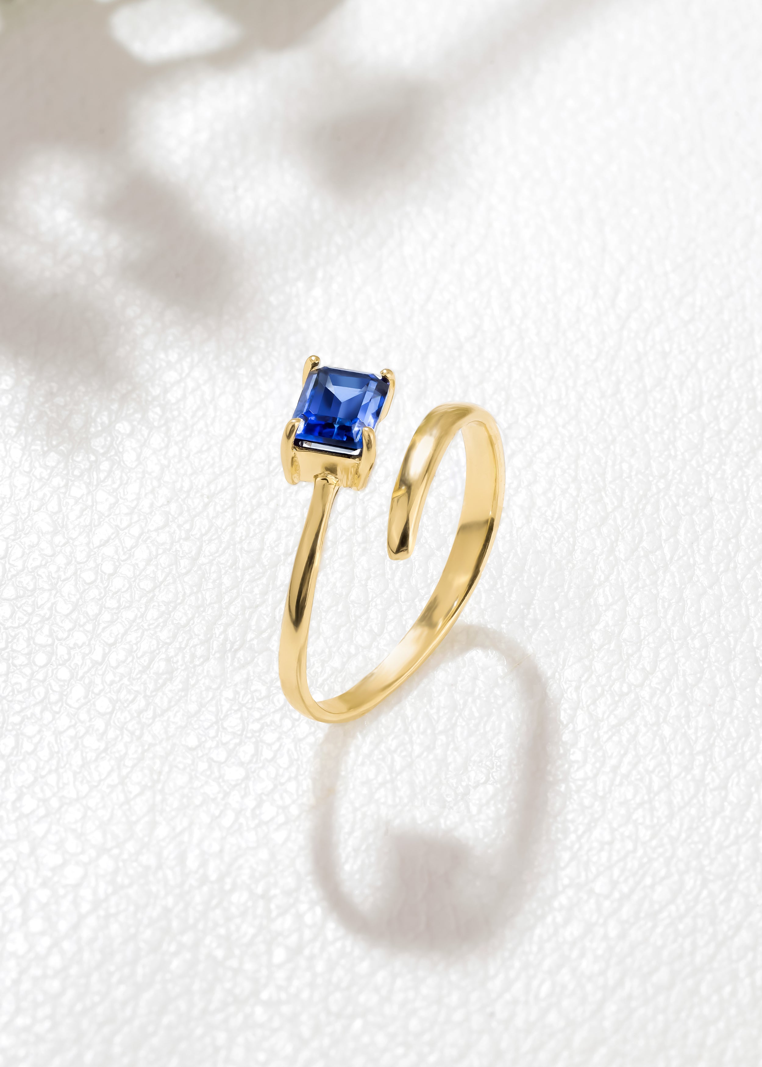 • Features a brilliant lab-created sapphire with rich blue color, set in a stylish bypass design that adds a modern, elegant touch.