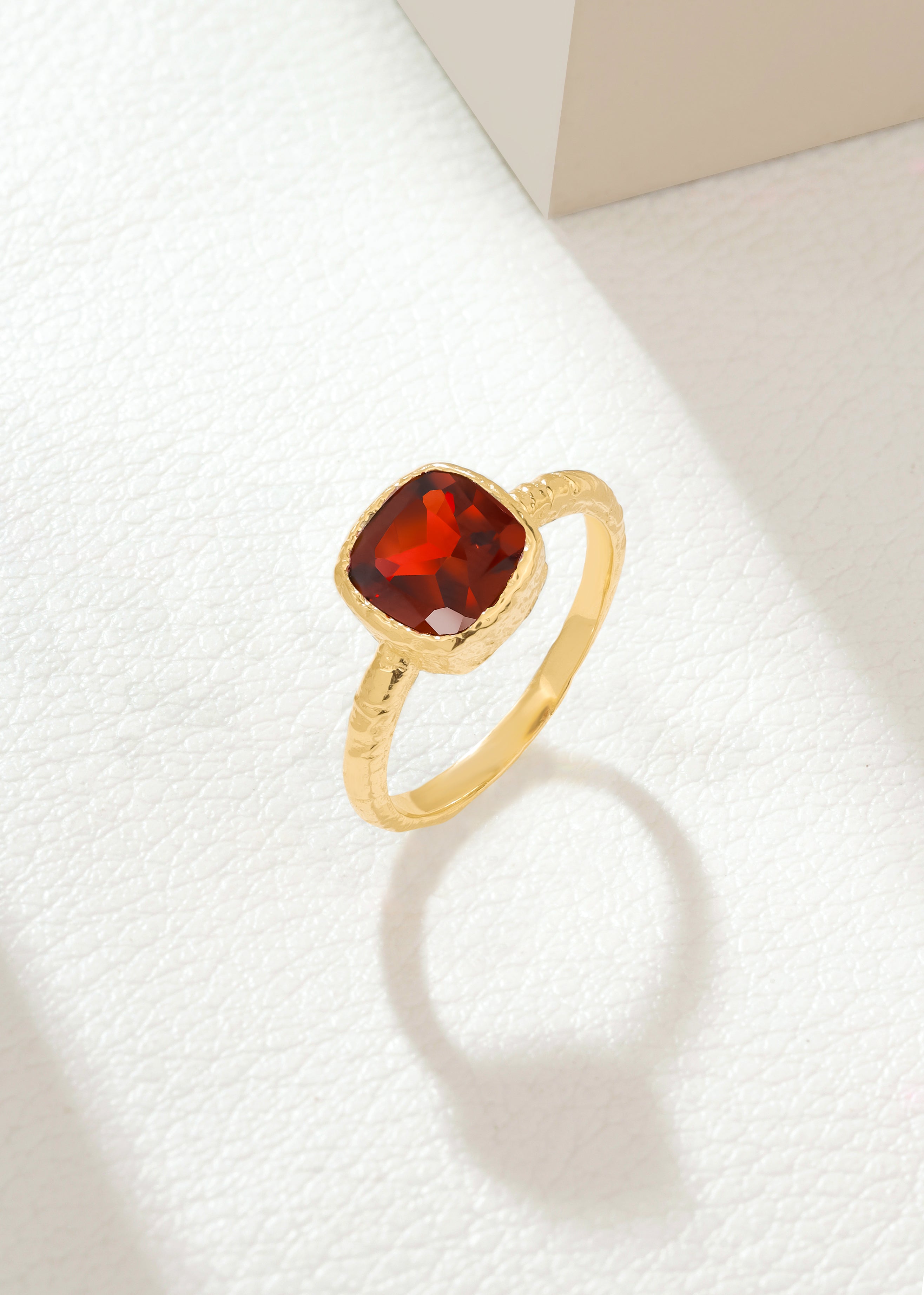 Elevate your everyday elegance with this timeless Garnet Solitaire Ring, crafted in 925 Sterling Silver and finished with rich 14K gold plating. At its center sits a deep red garnet gemstone, symbolizing passion, strength, and love, beautifully framed in a softly textured bezel setting. The subtly textured band adds an artisanal touch, making this ring effortlessly chic yet distinctive.