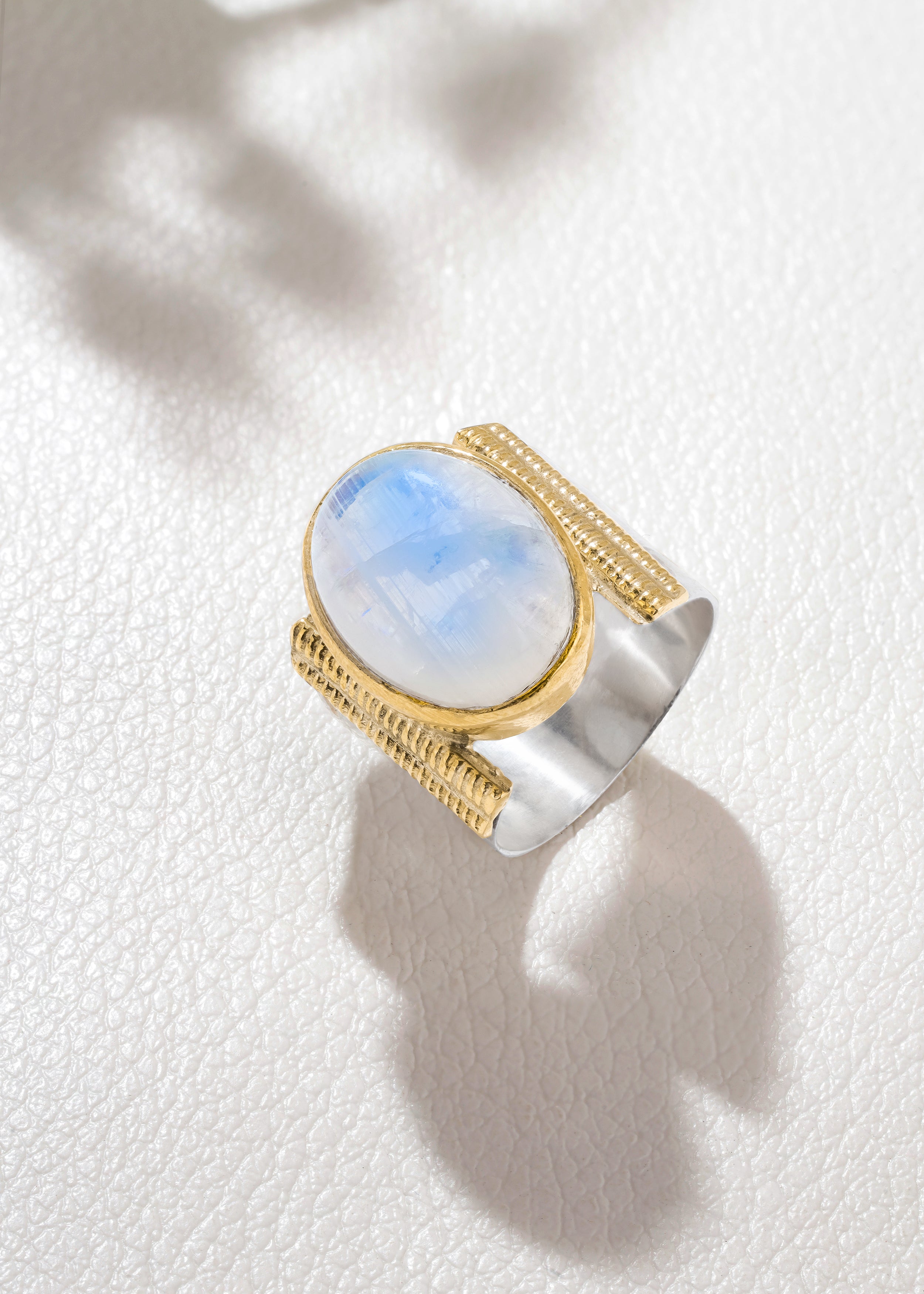 Solid 925 Sterling Silver & Brass Oval Moonstone Textured Statement Ring
