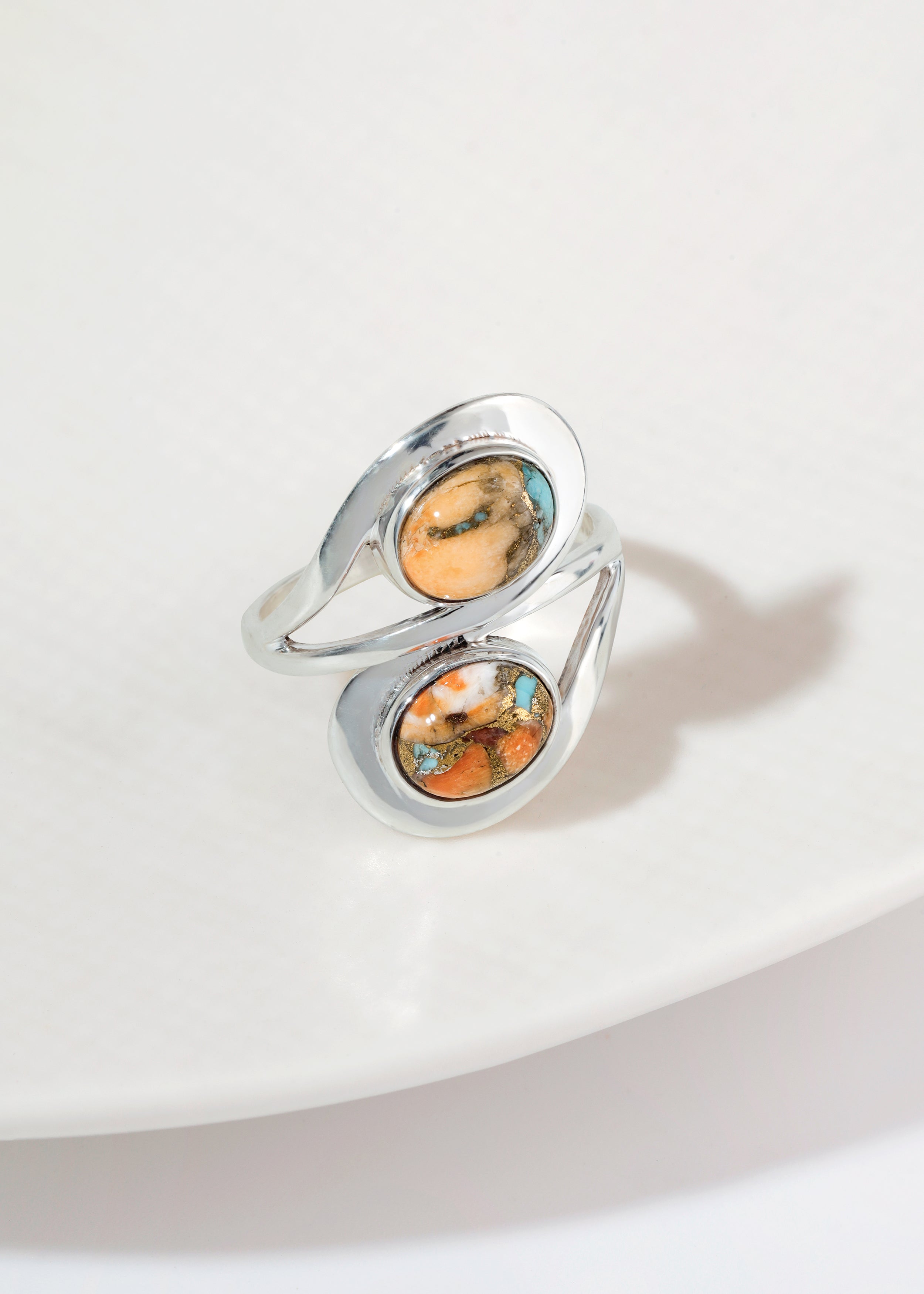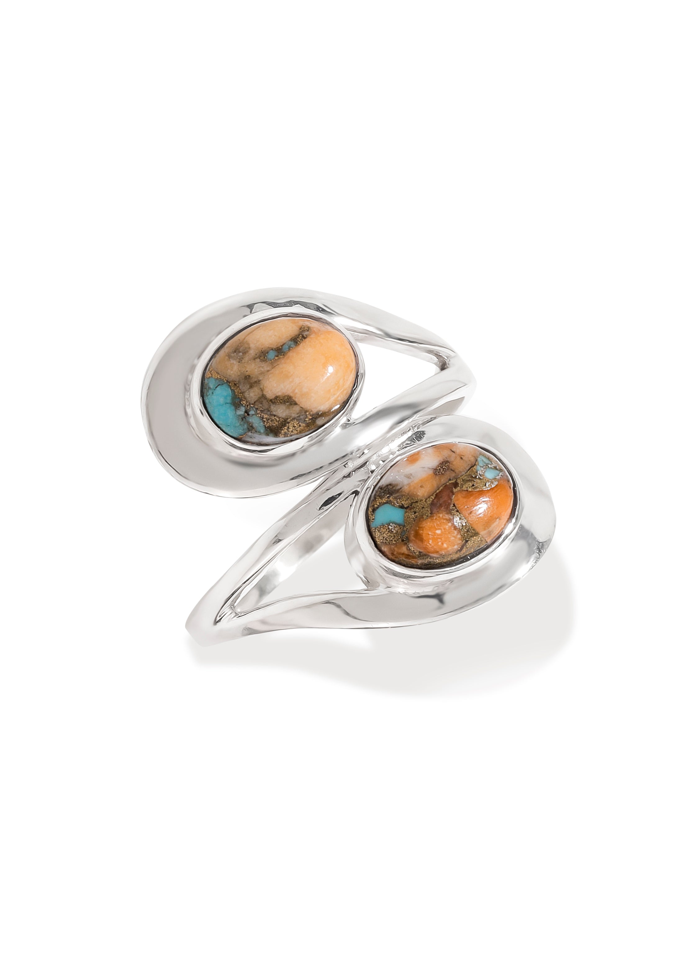Artfully modern, this Solid 925 Sterling Silver Oyster Copper Turquoise Ring features a graceful open-band design adorned with two oval gemstones. Each oyster copper turquoise displays a unique blend of warm copper, soft white, and vivid turquoise tones, creating a striking natural contrast. The fluid silver band wraps elegantly around the finger, offering both comfort and contemporary style—perfect for everyday wear or statement layering.