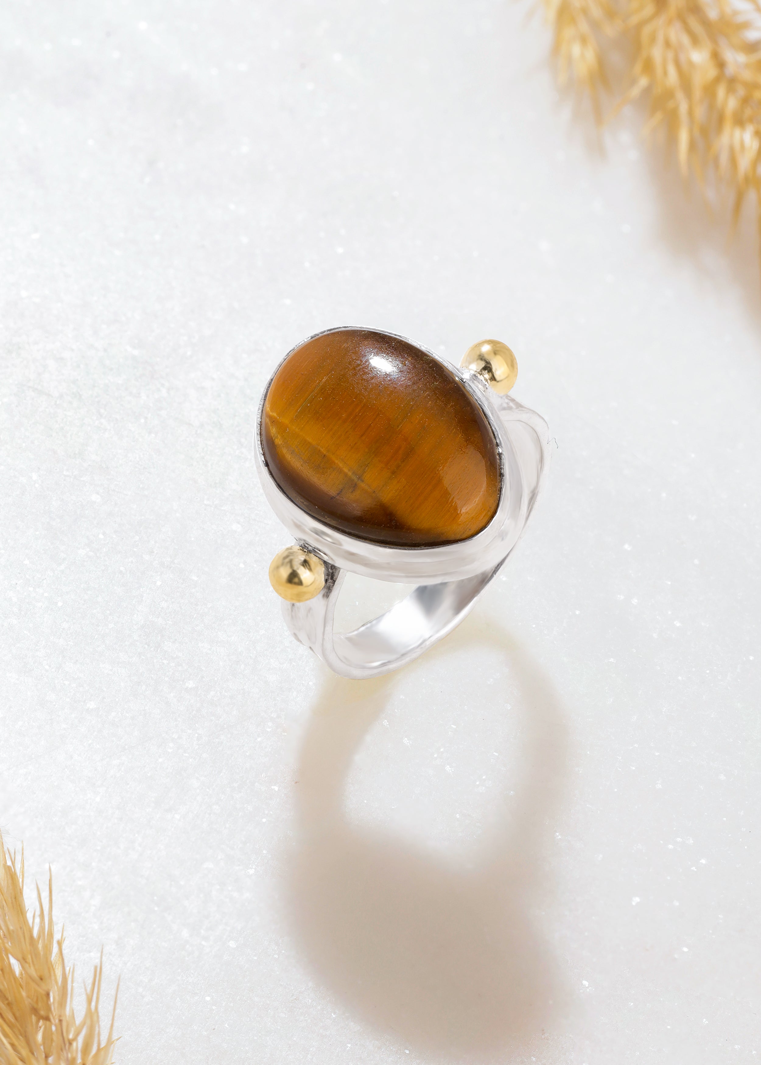 Solid 925 Sterling Silver Oval Tiger’s Eye Bezel-Set Statement Ring