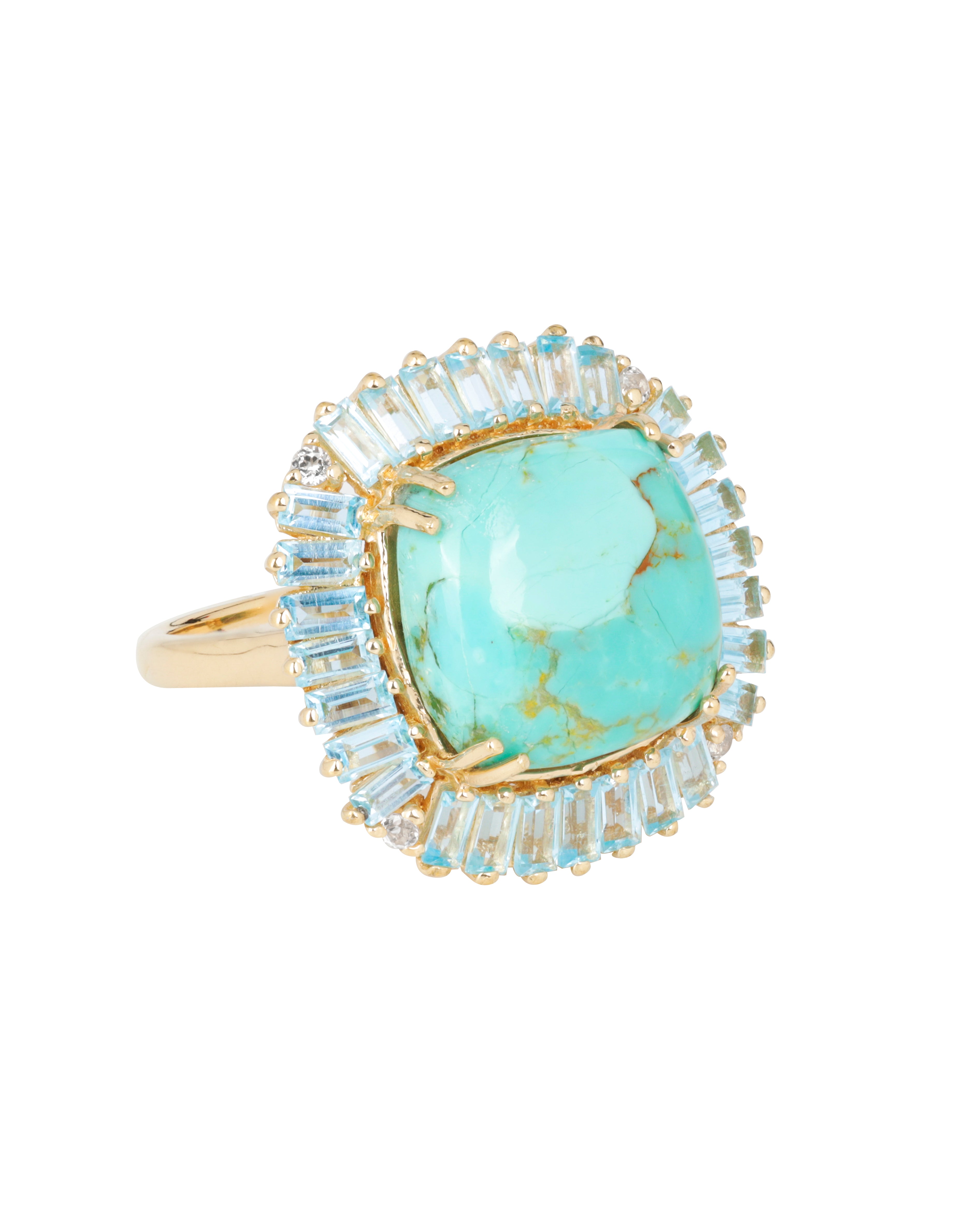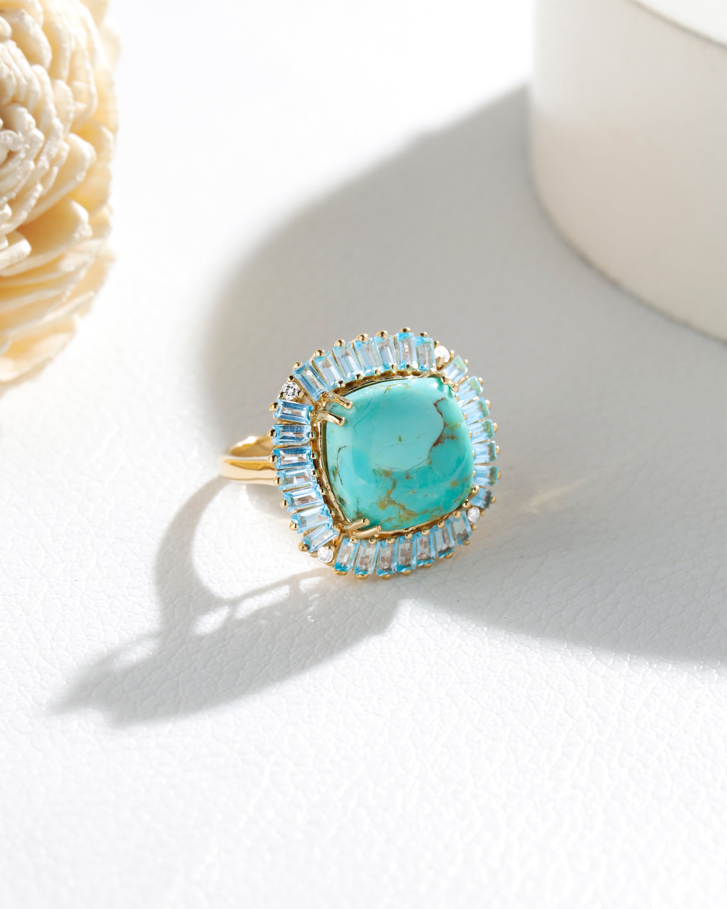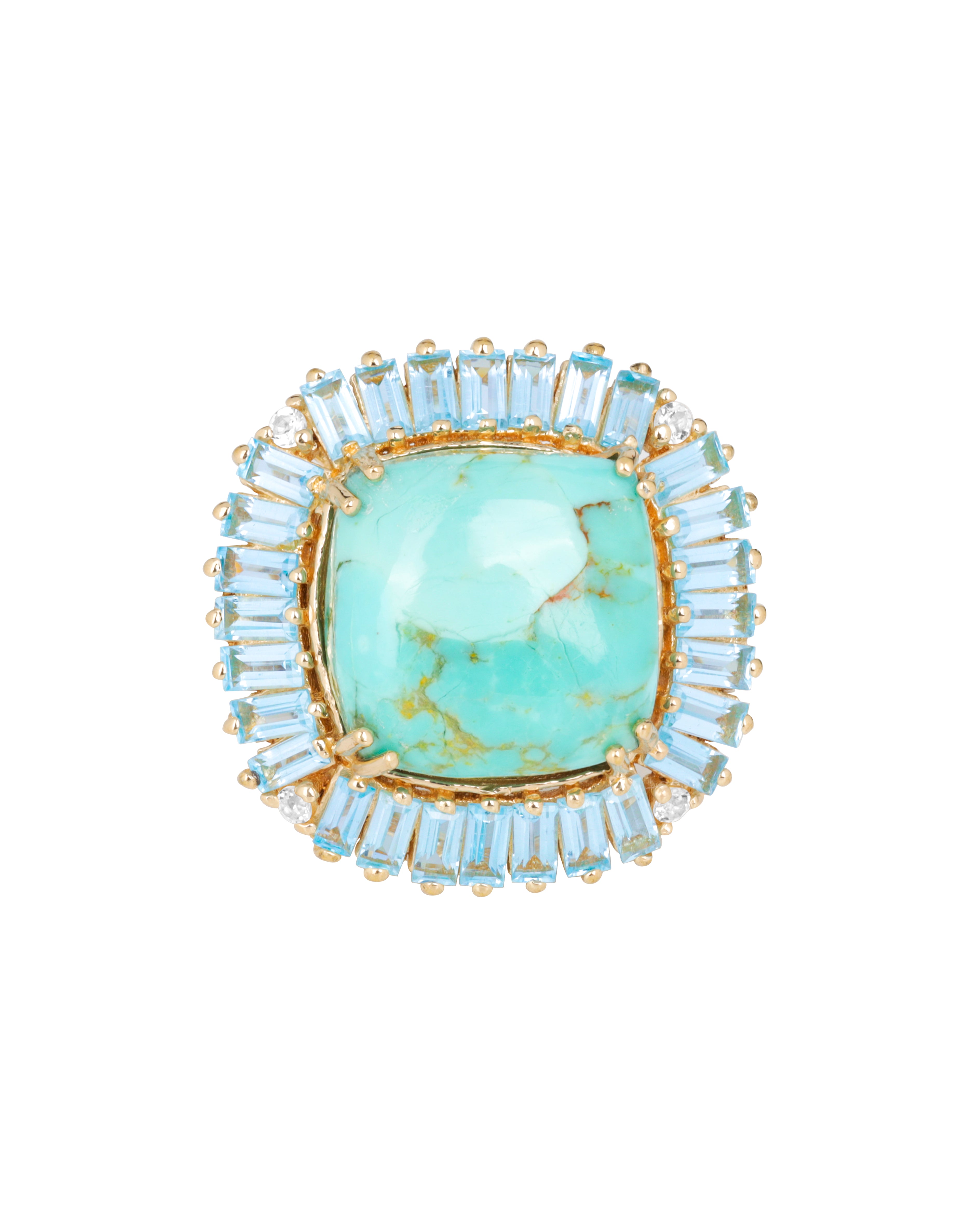 Like a jewel in the crown, this ring features a colorful cushion turquoise adorned with soft petals of blue topaz baguettes. Cocktail rings are iconic fashion statements, often worn to enhance outfits for social occasions, making this piece a dazzling addition to any ensemble. The 'Jewel in the Crown Ring' symbolizes prestige, excellence, and significance. It is a metaphorical expression derived from the idea of a precious gem being the most valuable and prominent part of a royal crown.
