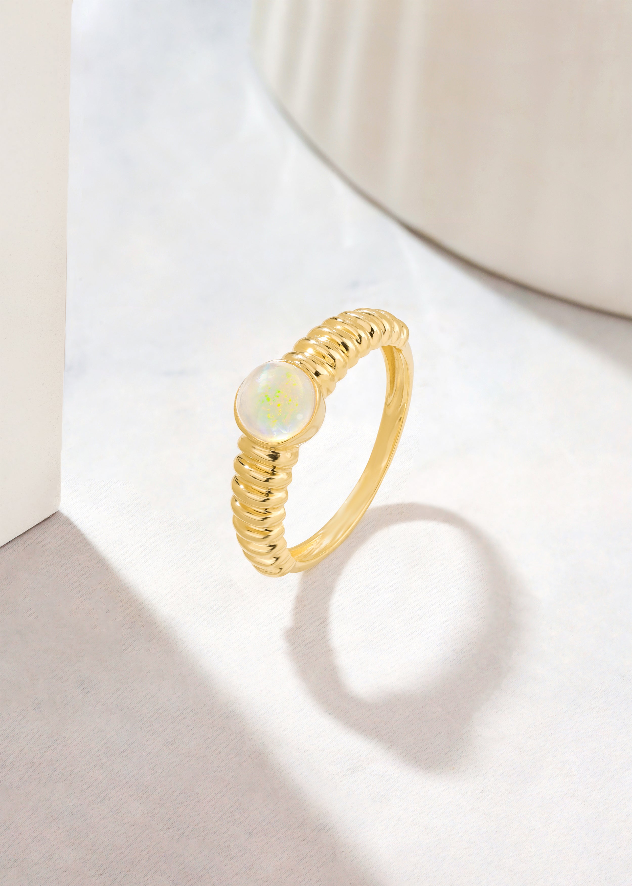 Highlight your style with the timeless charm of this Ethiopian Opal Ribbed Band Ring. Crafted in solid 925 sterling silver and finished with luxurious 14K gold plating, this elegant ring features a luminous Ethiopian opal at its center, glowing with soft rainbow flashes. The sculpted ribbed band adds texture and depth, creating a bold yet refined look that stands out effortlessly.