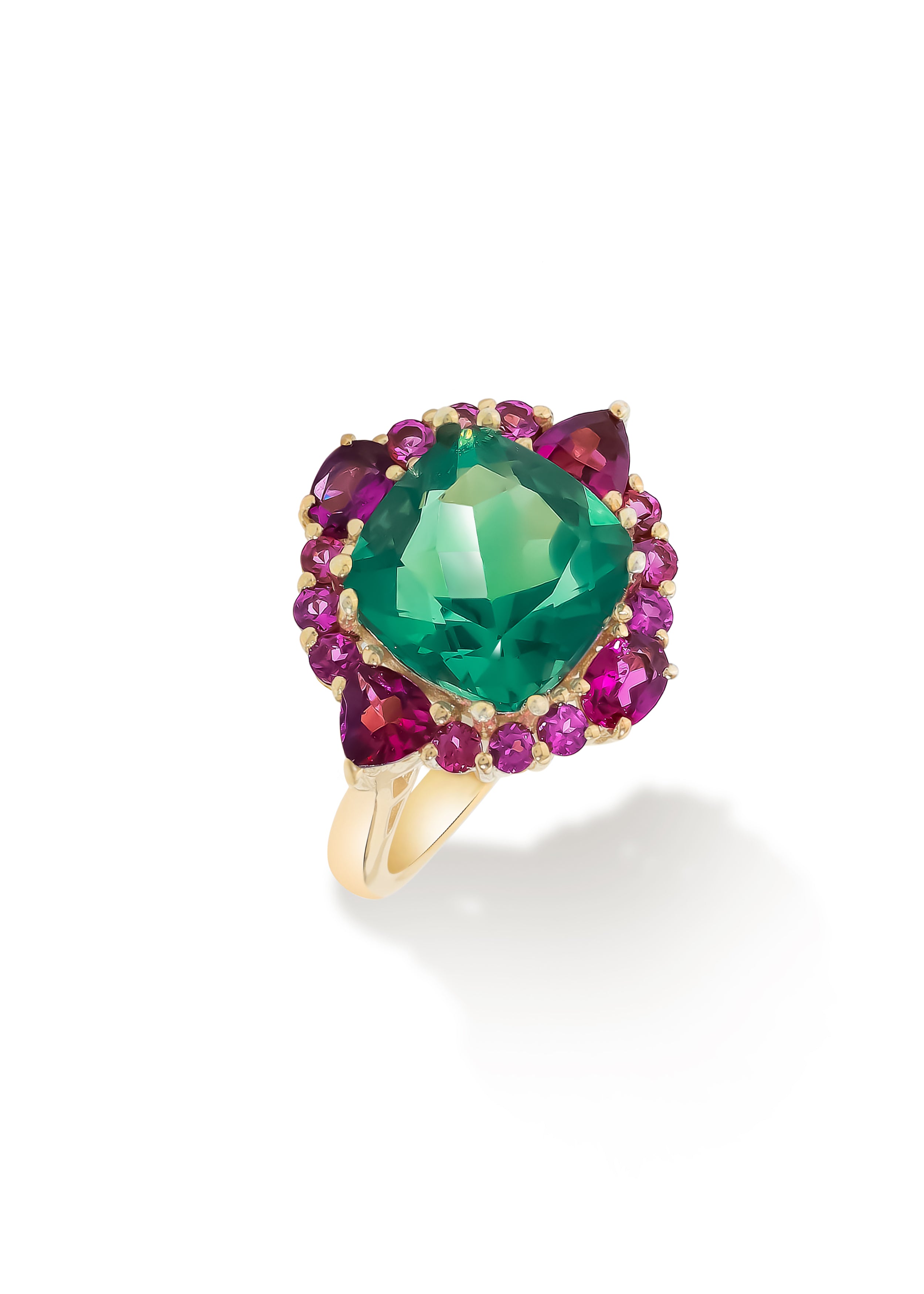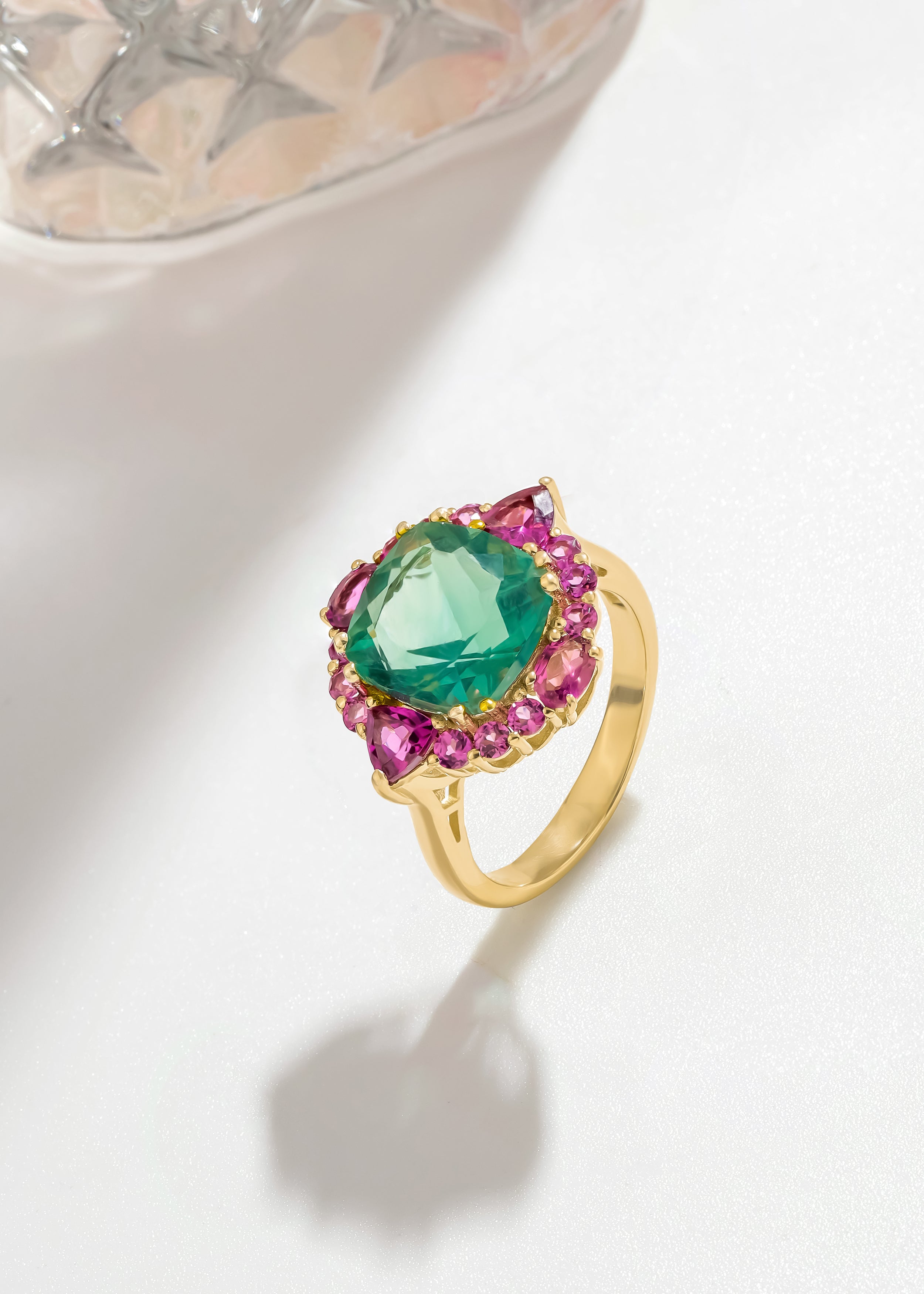 Vibrant and romantic, this 14K Gold Plated 925 Sterling Silver Statement Ring features a captivating green fluorite centerpiece surrounded by a blooming cluster of rich rhodolite garnets. The floral-inspired arrangement creates a bold yet elegant silhouette, while the warm gold-plated finish enhances the gemstone colors with luxurious contrast. Designed to stand out, this ring is perfect for special occasions or expressive everyday styling.