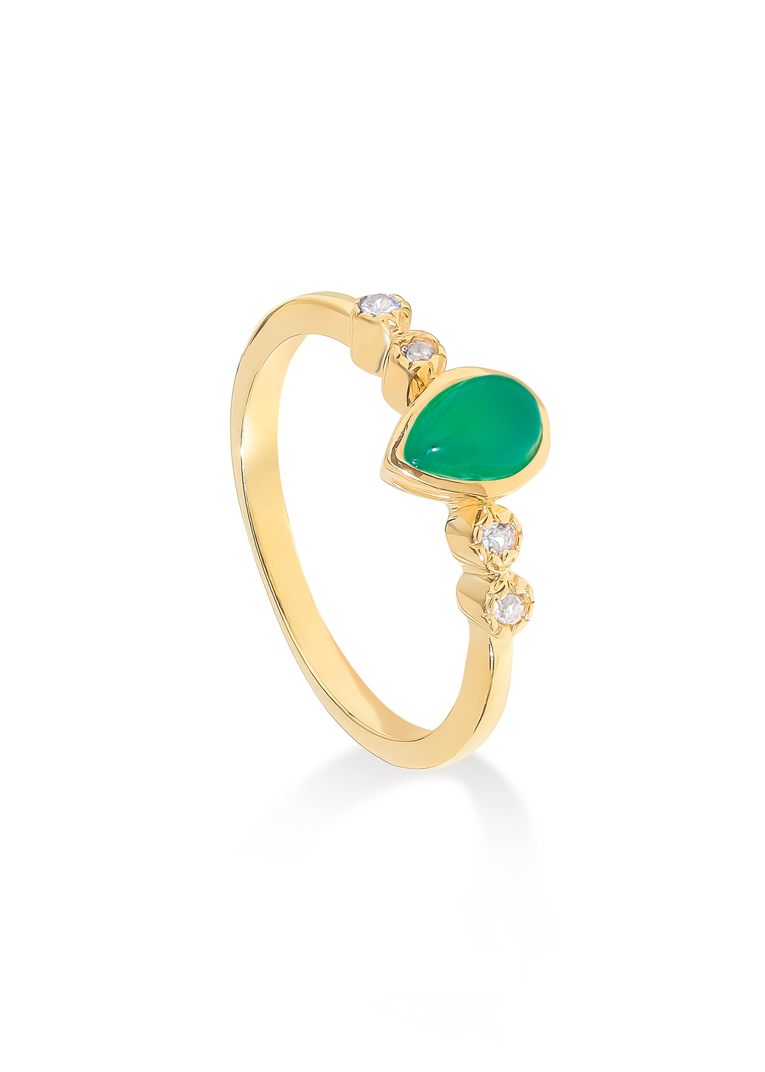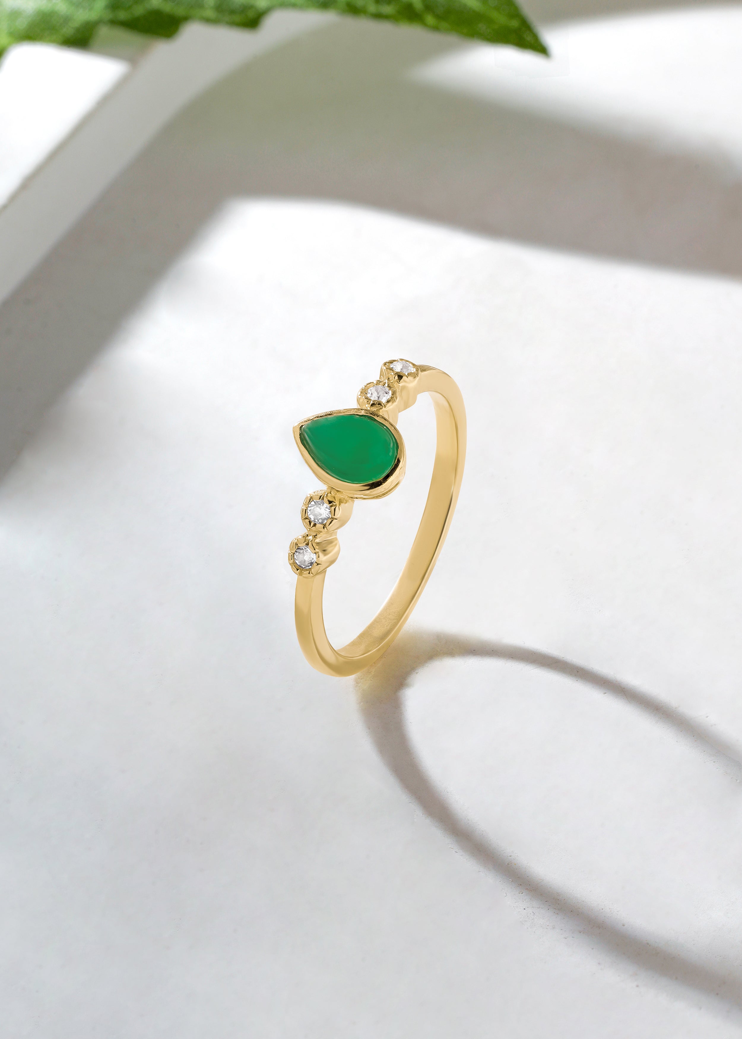 • Features a 4x6 mm Pear Green Onyx with 1.5 mm Round White Topaz stones for a vibrant and striking hue