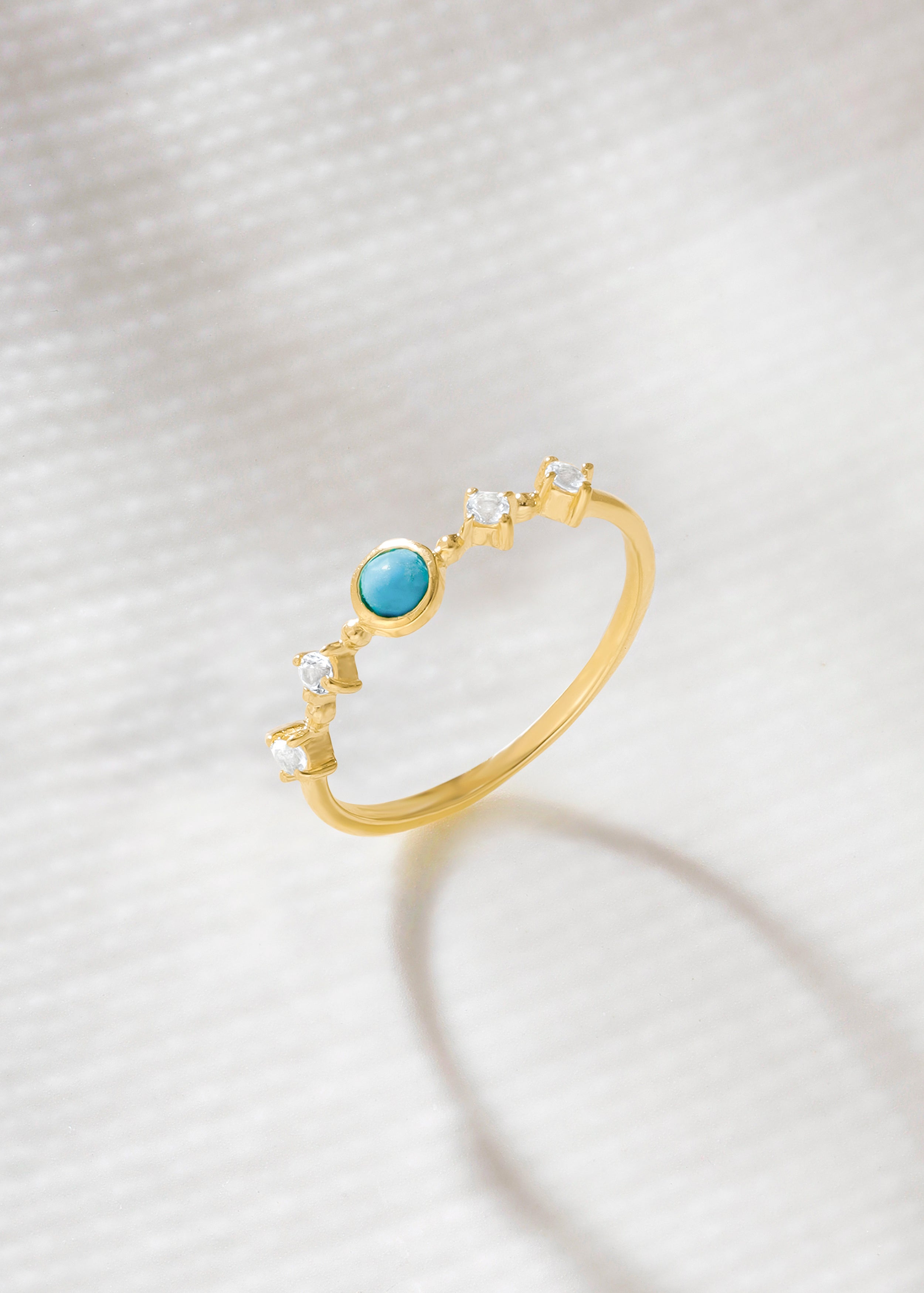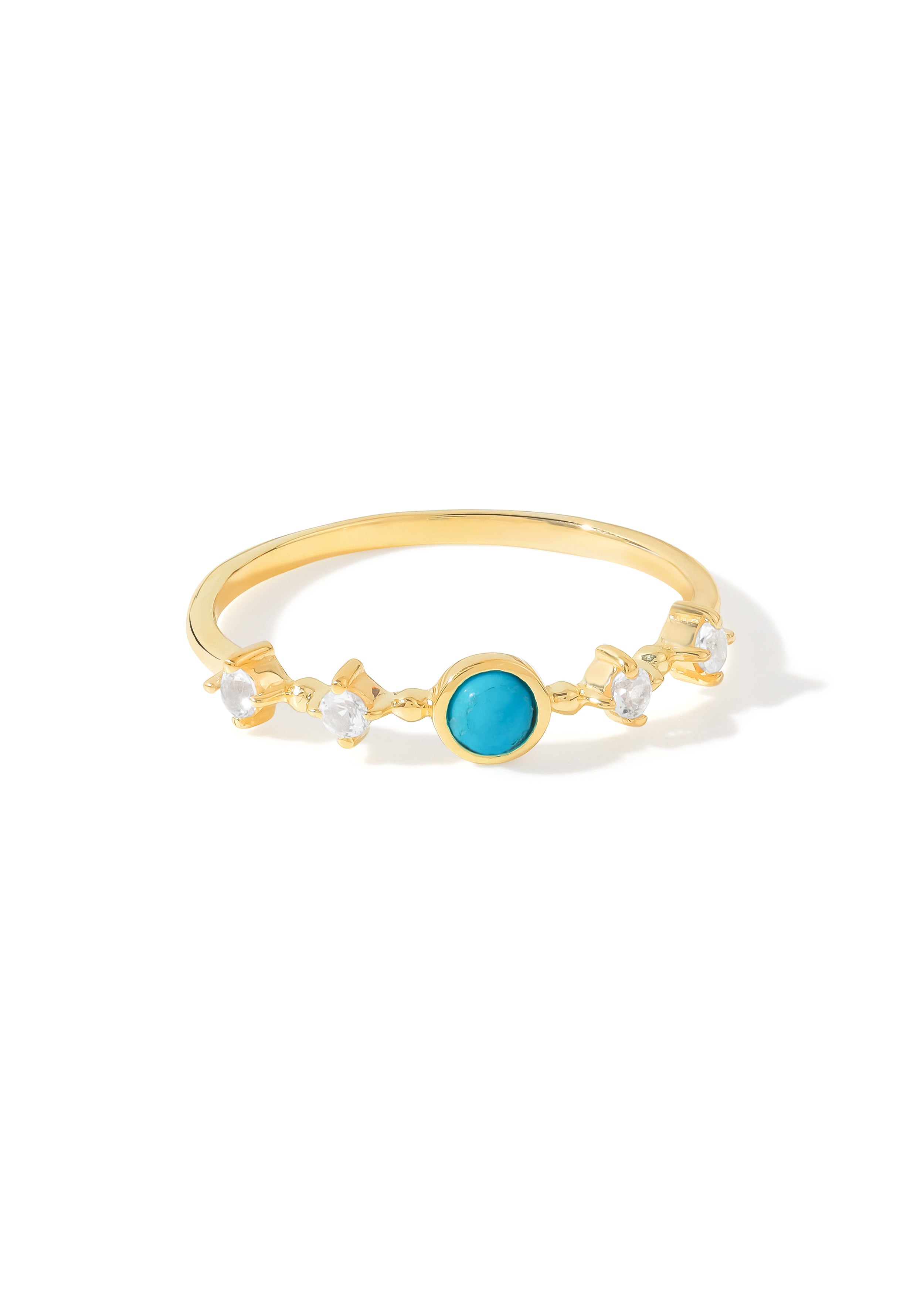 This ring highlights the serene beauty of Arizona turquoise, framed by shimmering white topaz accents. The soft round turquoise center brings a pop of natural color, while the delicate topaz stones add a graceful sparkle. Balanced and refined, this ring is perfect for everyday wear, stacking, or adding a subtle statement to your look.