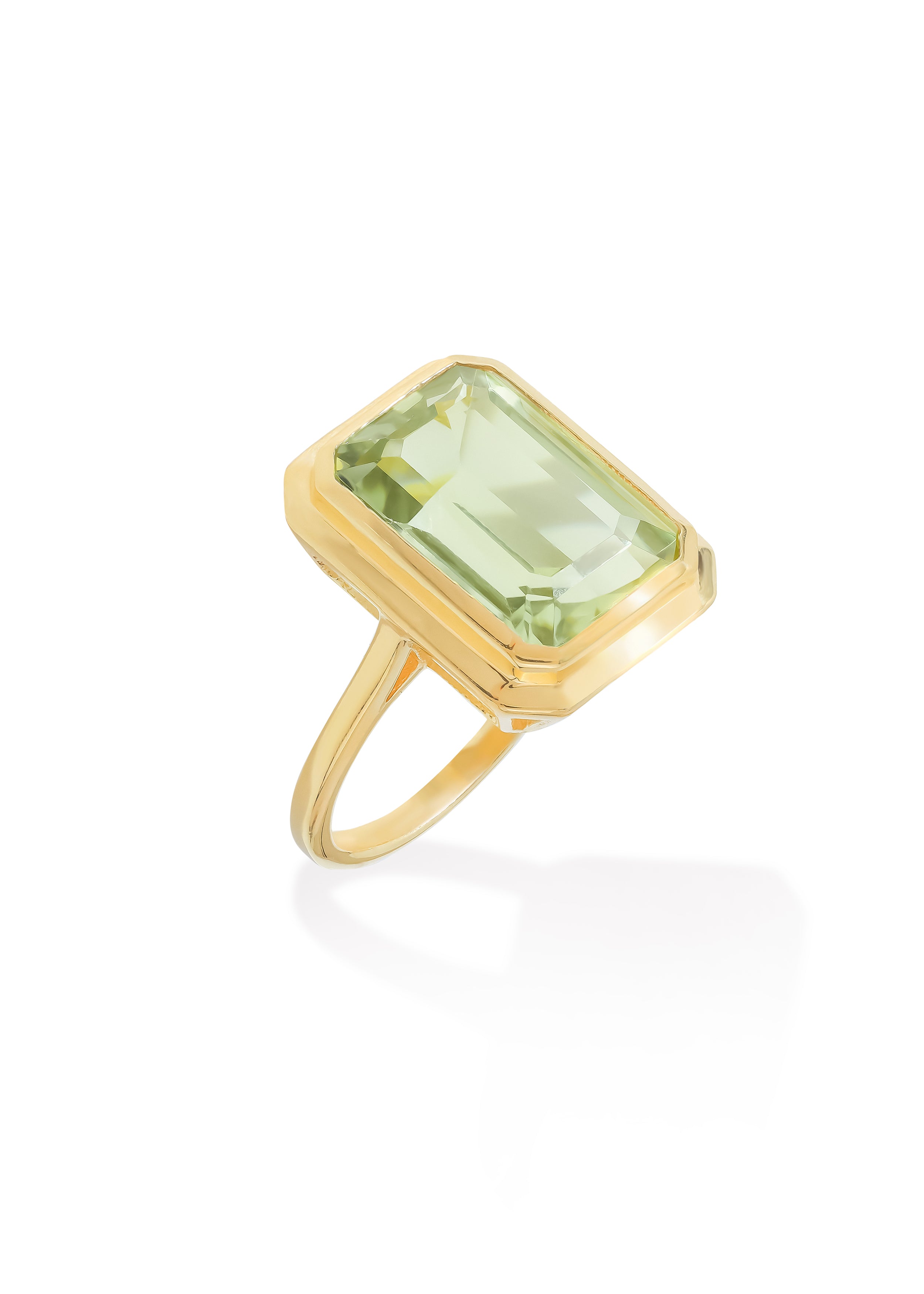 • Features an emerald-cut green amethyst with soft, luminous green tones