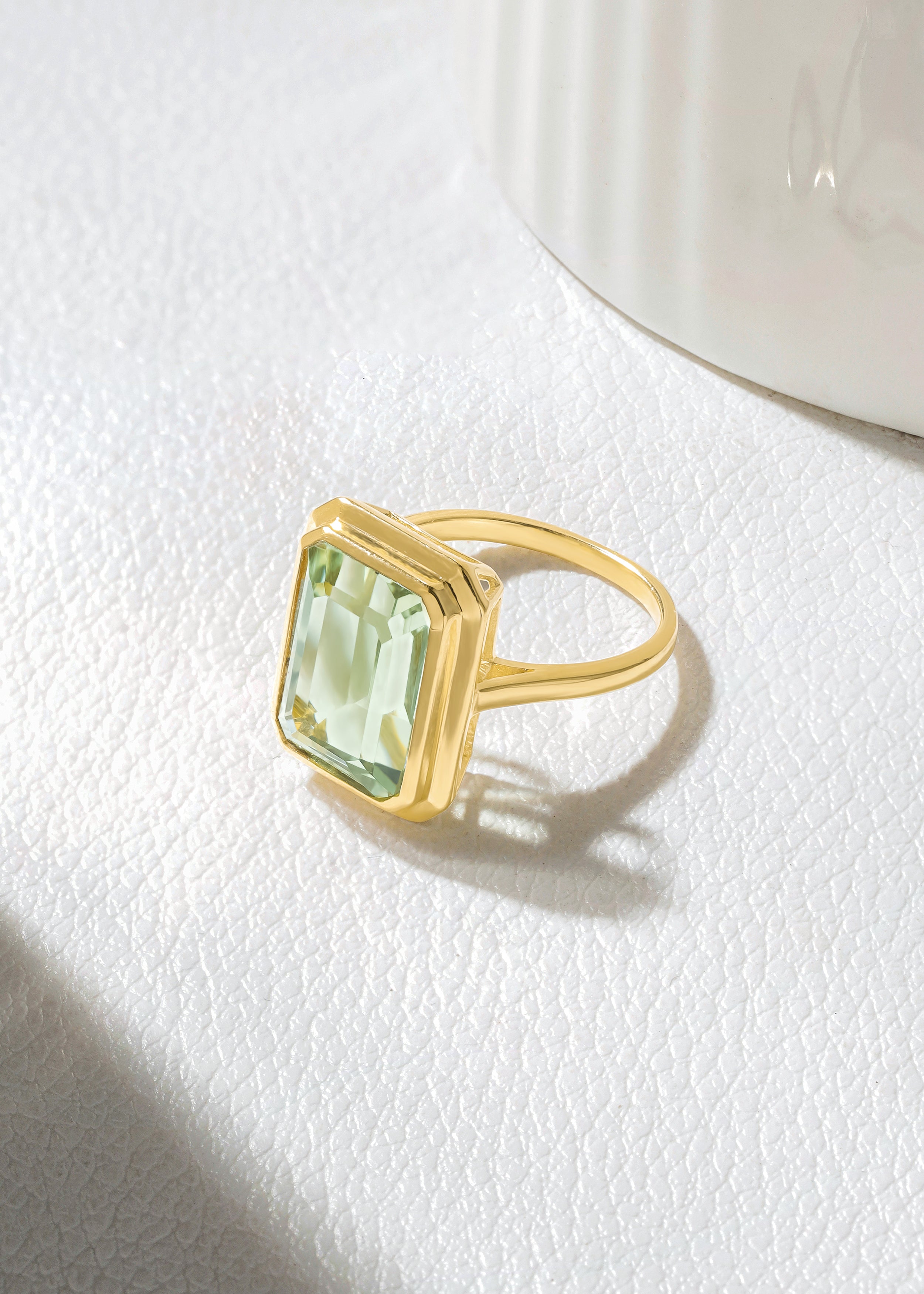 Enhance your jewelry collection with this stunning green amethyst statement ring! Elegant and modern, this ring is crafted from gold-plated 925 sterling silver and features a striking emerald-cut gemstone surrounded by a bold, stepped bezel. The soft green hue of the amethyst is beautifully complemented by the warm gold-plated finish, creating a refined statement piece with architectural appeal. Designed for women who value contemporary elegance, this ring is perfect for special occasions or for adding a touch of sophistication to your everyday wear.