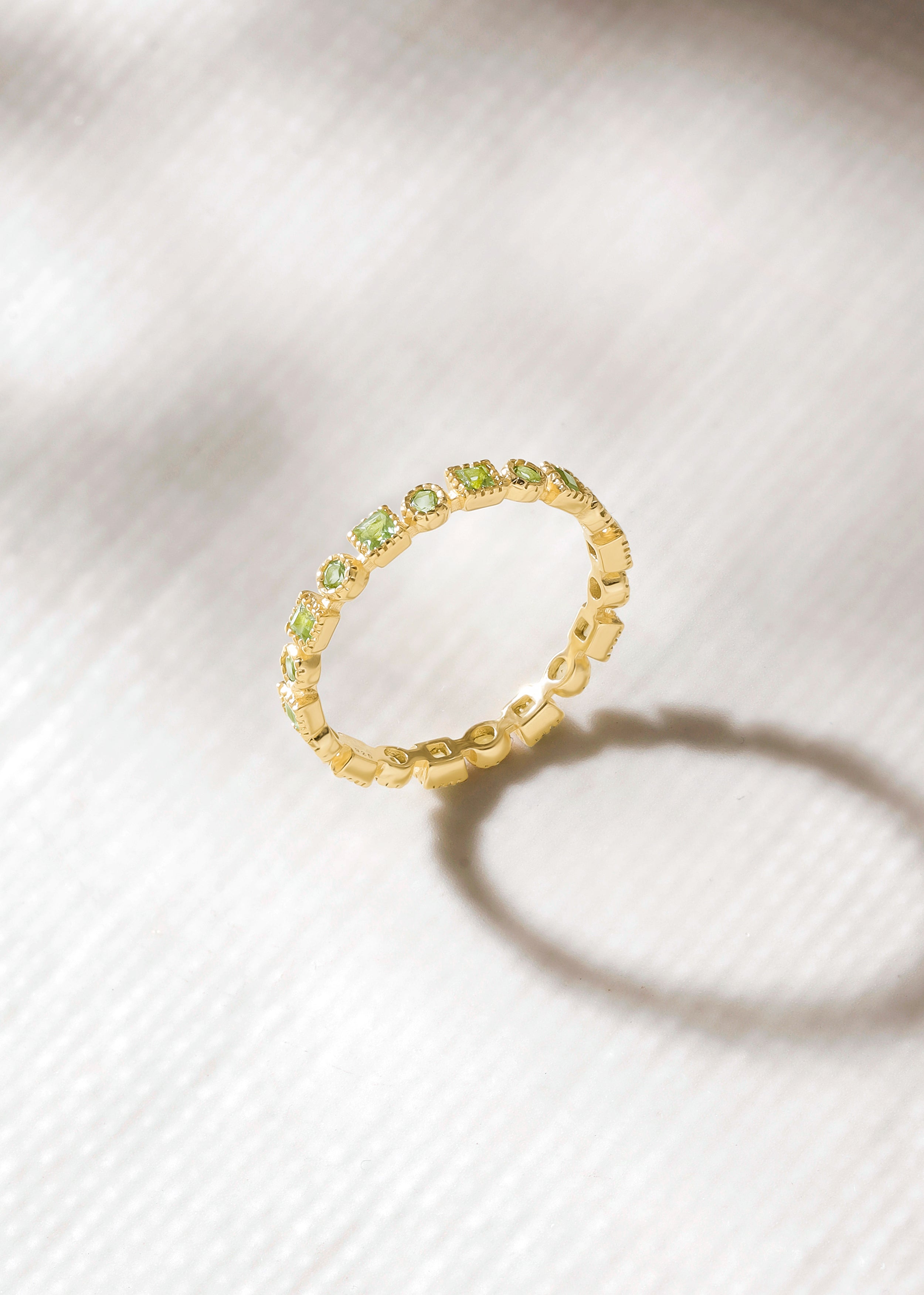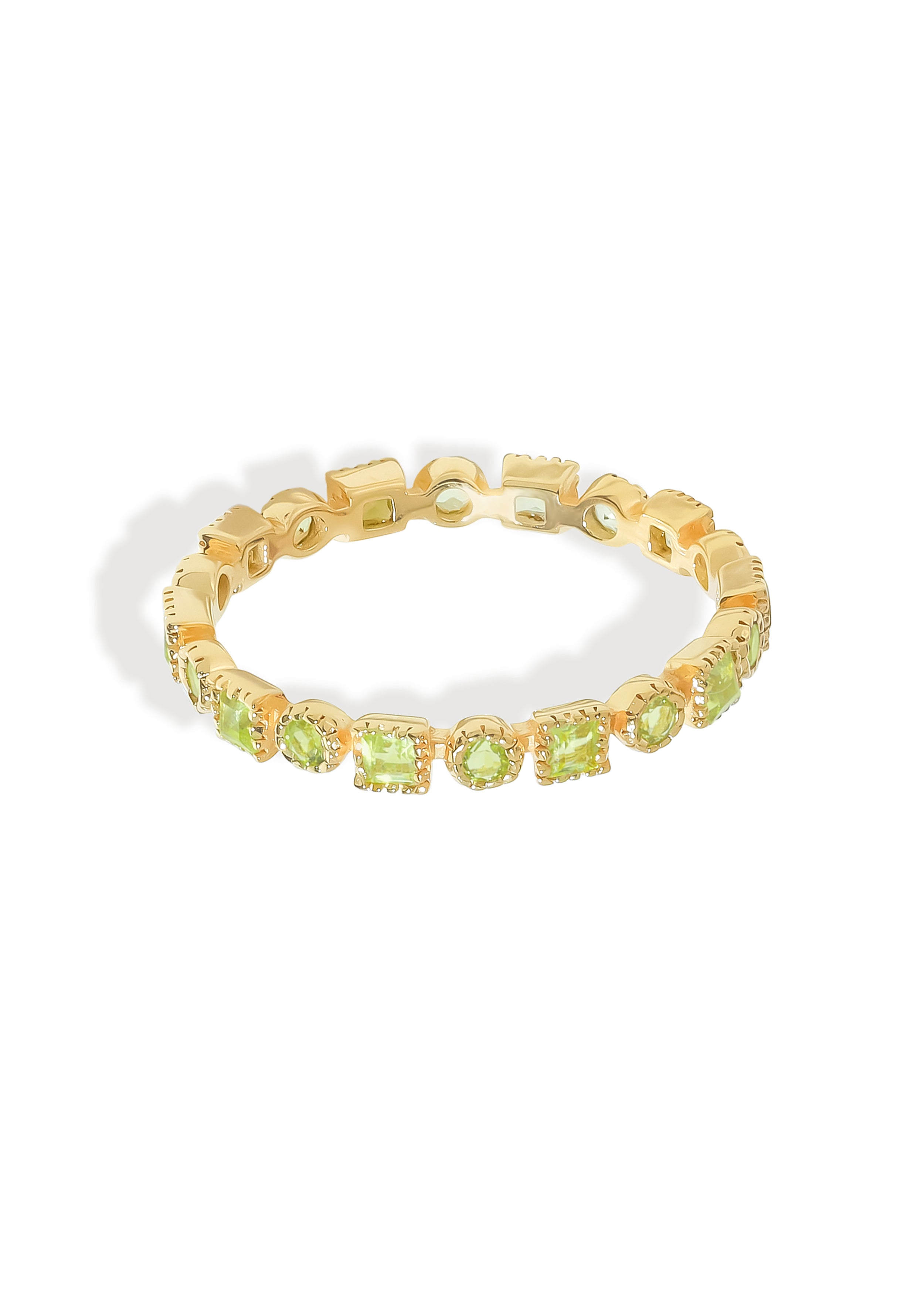 Elevate your style with this chic peridot band ring! Featuring round and square peridots, it brings a fresh pop of green with a modern geometric touch. The warm gold-plated finish adds a radiant glow, making it perfect for everyday wear or special moments.