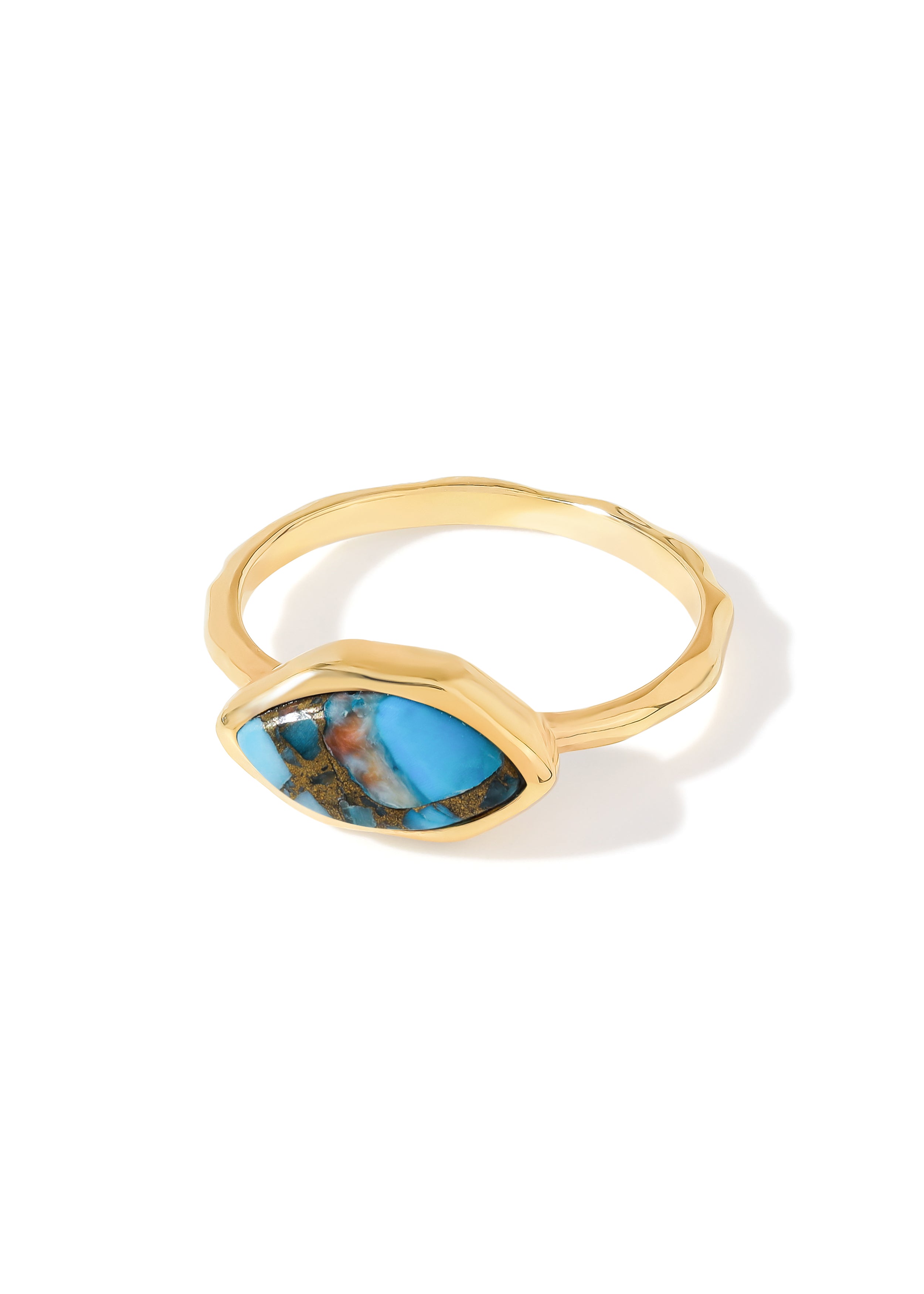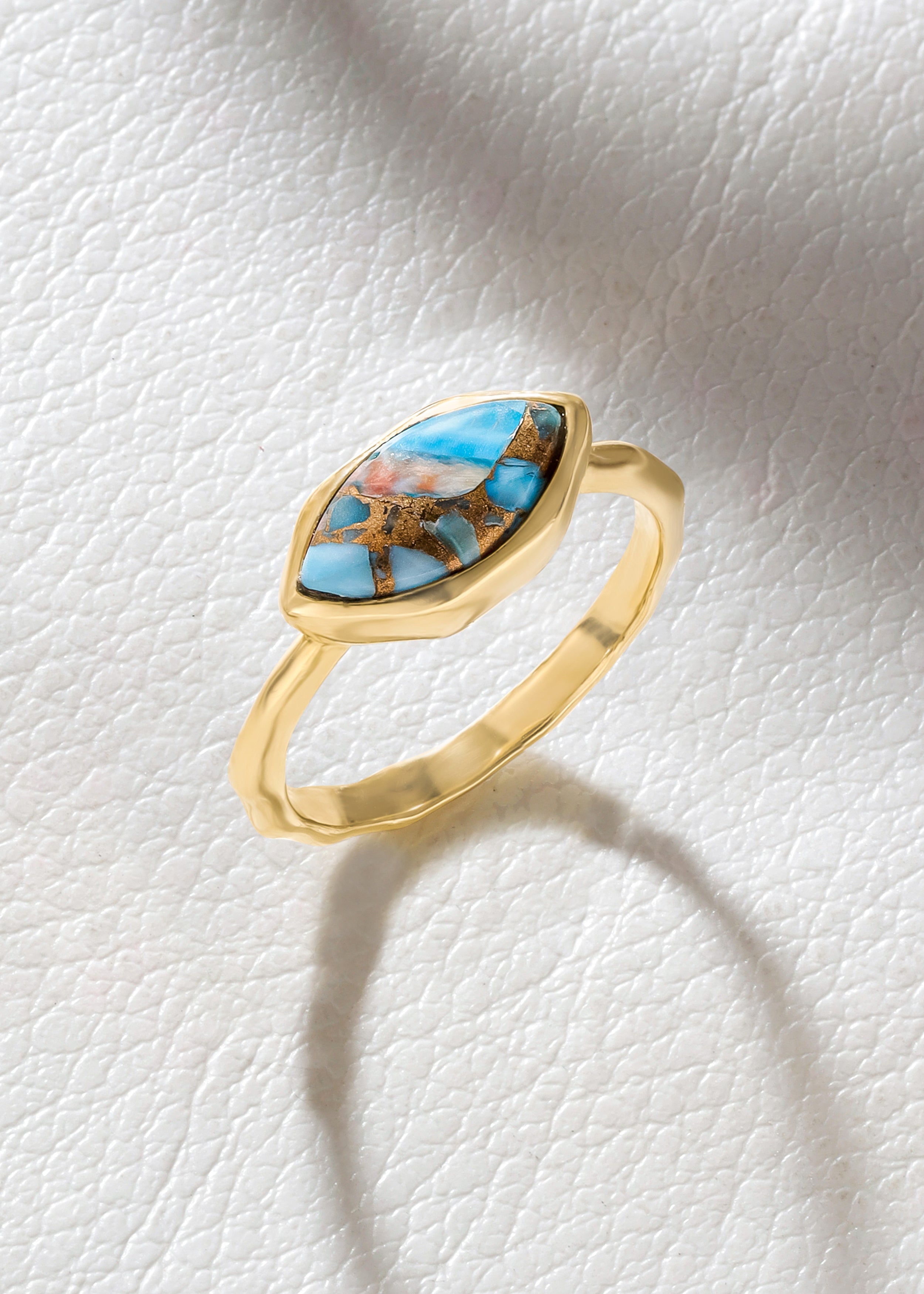 Let your hands do the talking with this striking wave band ring. The marquise Blue Dahlia Turquoise glows with natural blue-green beauty, while the 14K gold-plated finish adds a warm, refined touch. Designed to move gracefully with you, this ring brings confidence, charm, and standout style to any look.