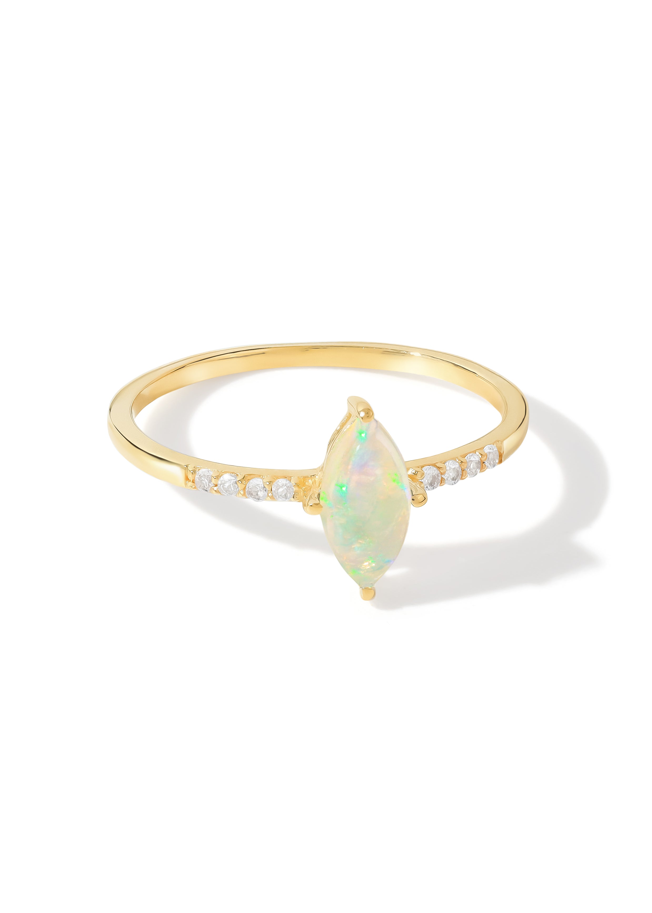 Radiant and otherworldly, the Celestial Fire Ring showcases a marquise-cut Ethiopian opal alive with flashes of fiery color. Delicately accented by sparkling white topaz, the design captures light from every angle, creating a soft yet captivating glow. Finished in warm gold plating over sterling silver, this ring blends celestial beauty with refined elegance—perfect for moments that deserve to shine.