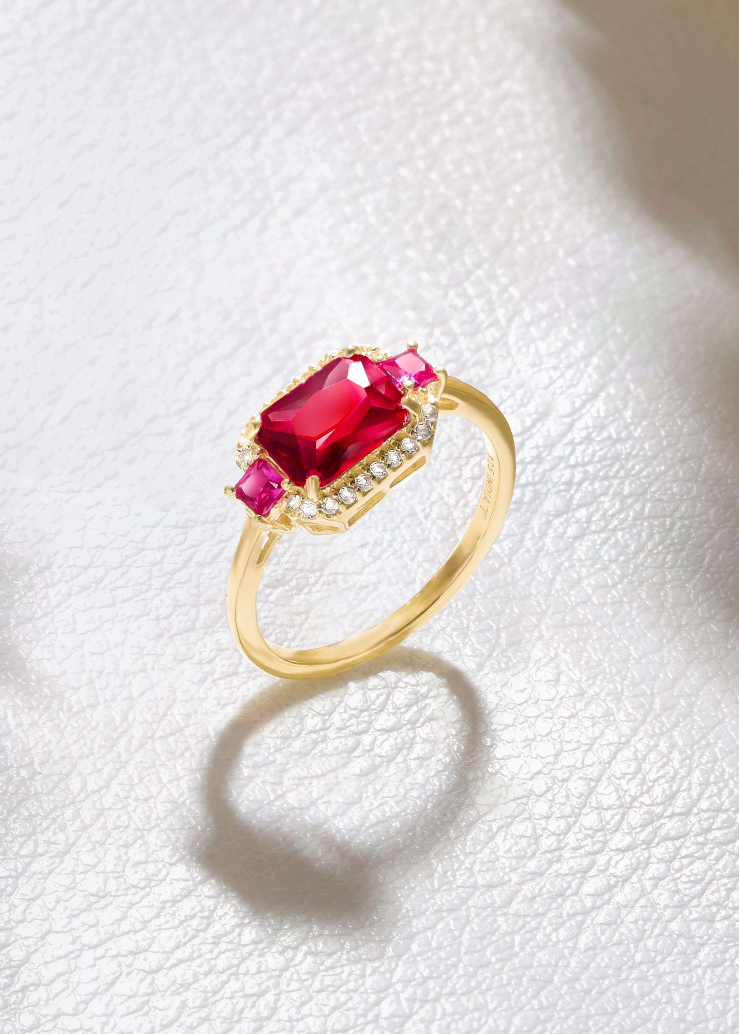 • Features a vibrant lab-created ruby, beautifully framed by white topaz accents that add extra sparkle and sophistication.