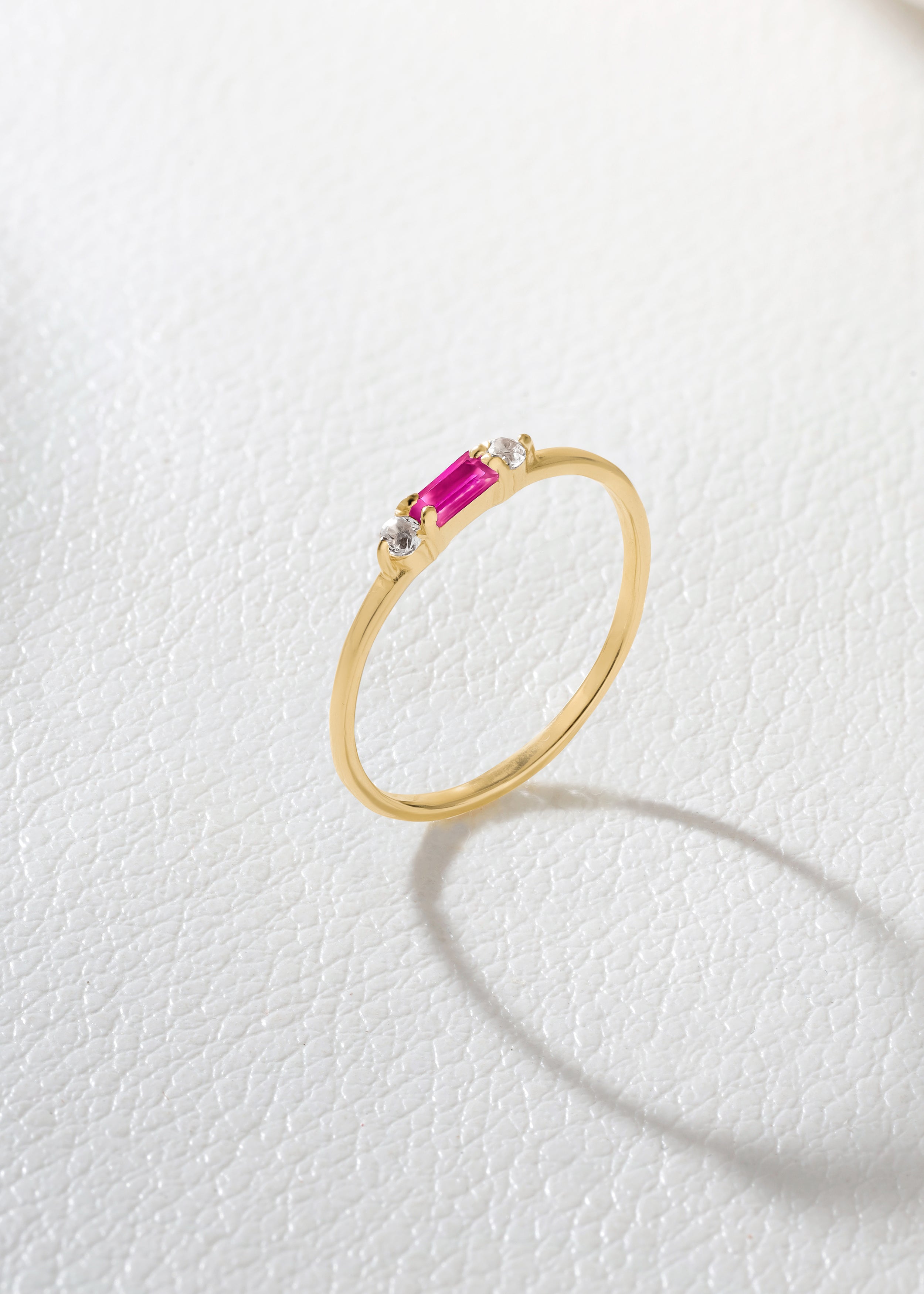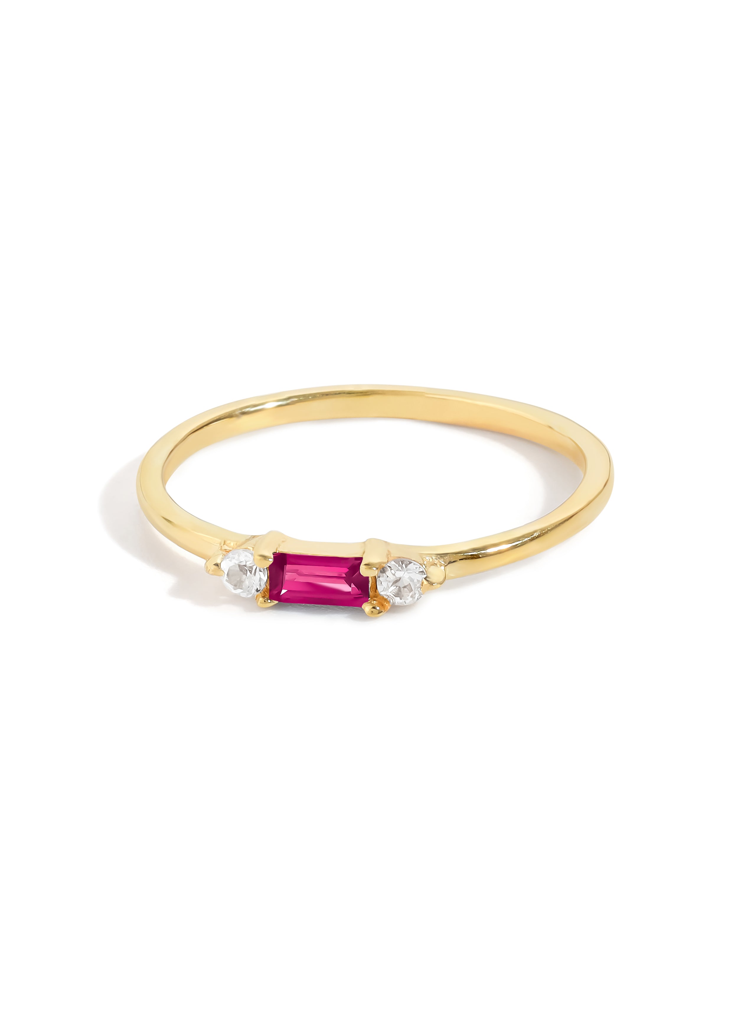 This dainty ruby ring brings a vibrant touch of color to your everyday look. Featuring a baguette-cut lab-created ruby framed by two sparkling White Topaz stones, this minimalist band shines beautifully on its own or paired with your favorite stacking rings.