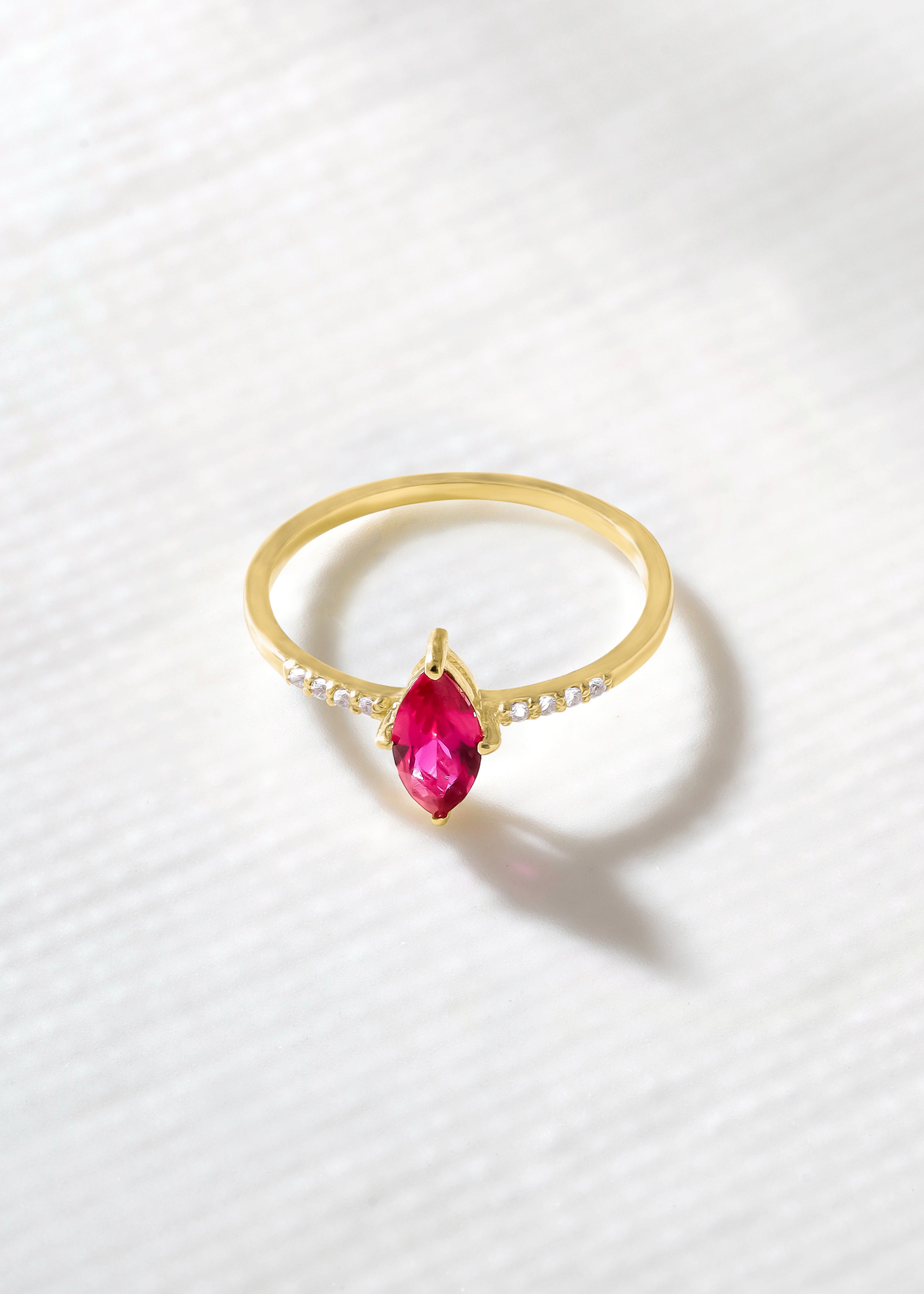 Bold yet elegant, the Crimson Grace Ring features a marquise-cut lab-created ruby glowing with deep crimson brilliance. Delicate white topaz accents enhance the center stone, adding refined sparkle and balance. Finished in radiant gold plating over sterling silver, this ring captures timeless romance and modern sophistication—perfect for moments that deserve a touch of passion.