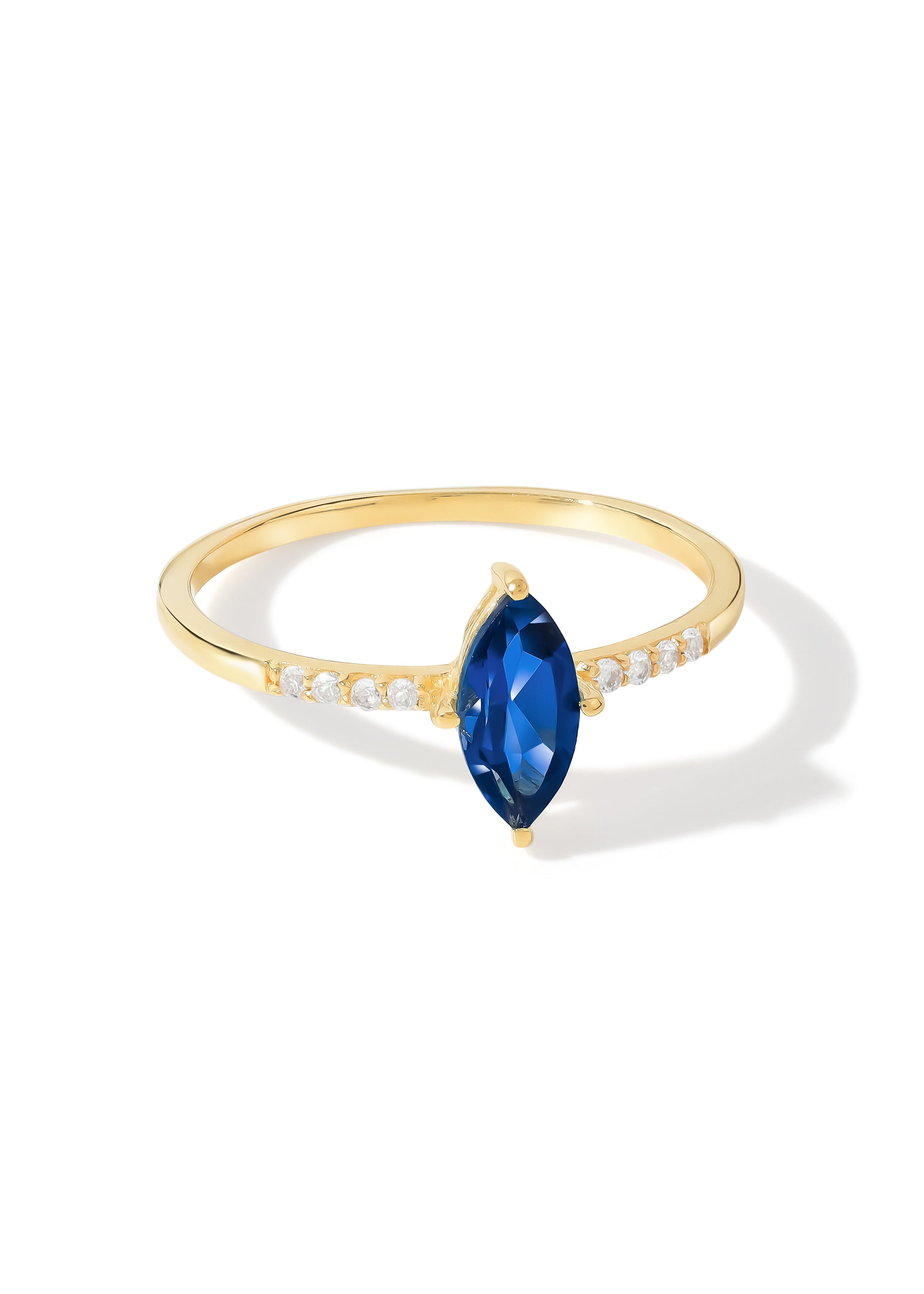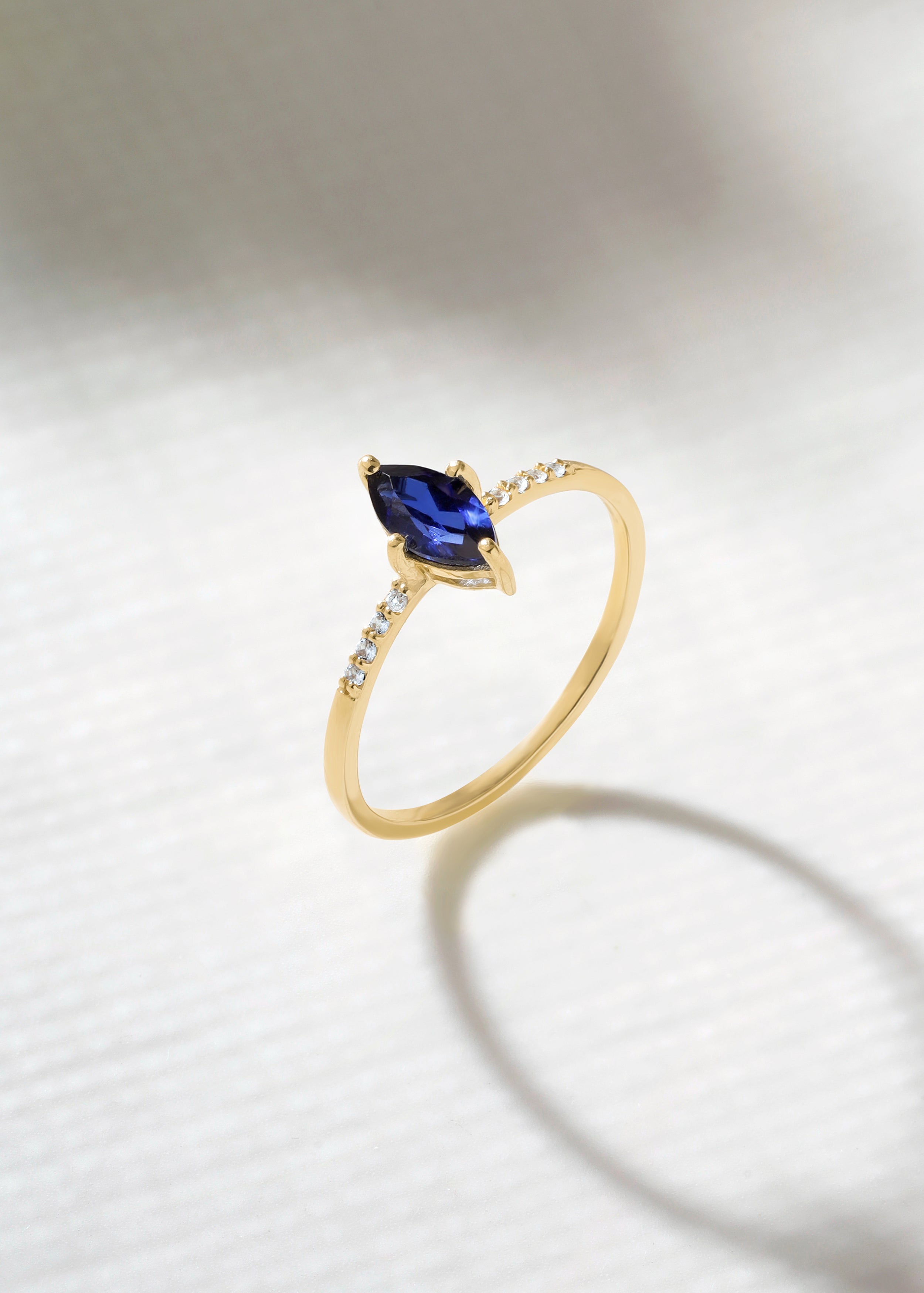 Regal and captivating, the Royal Azure Ring features a marquise-cut lab-created sapphire glowing in rich, royal blue tones. Framed by sparkling white topaz accents, the design reflects light beautifully with every movement. Finished in luminous gold plating over sterling silver, this ring blends classic sophistication with modern elegance—perfect for statement moments and refined everyday wear alike.