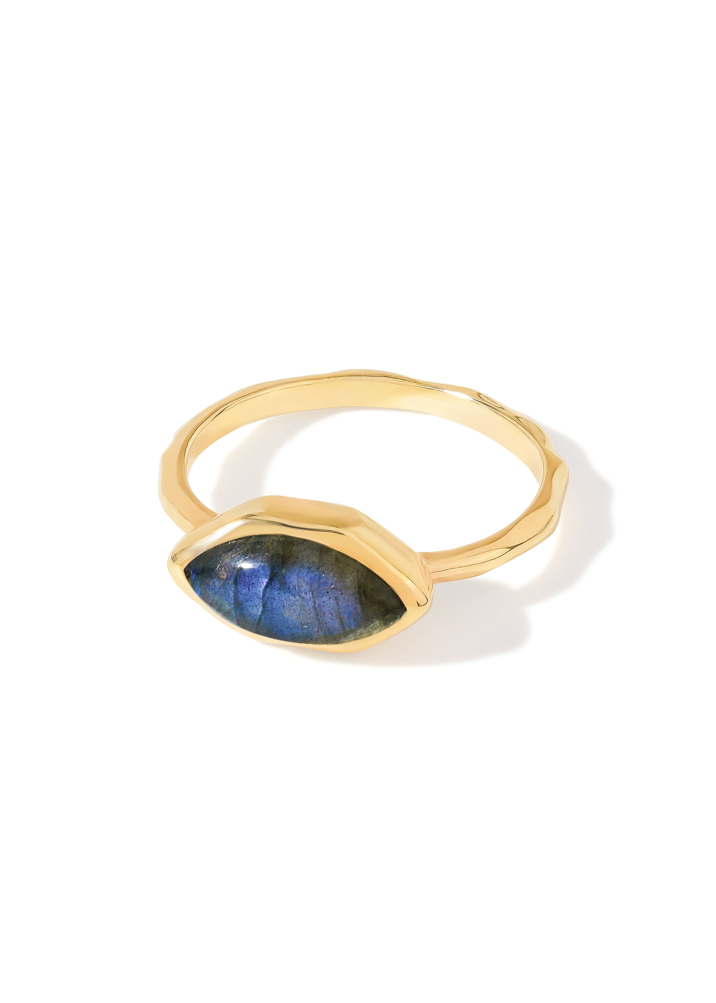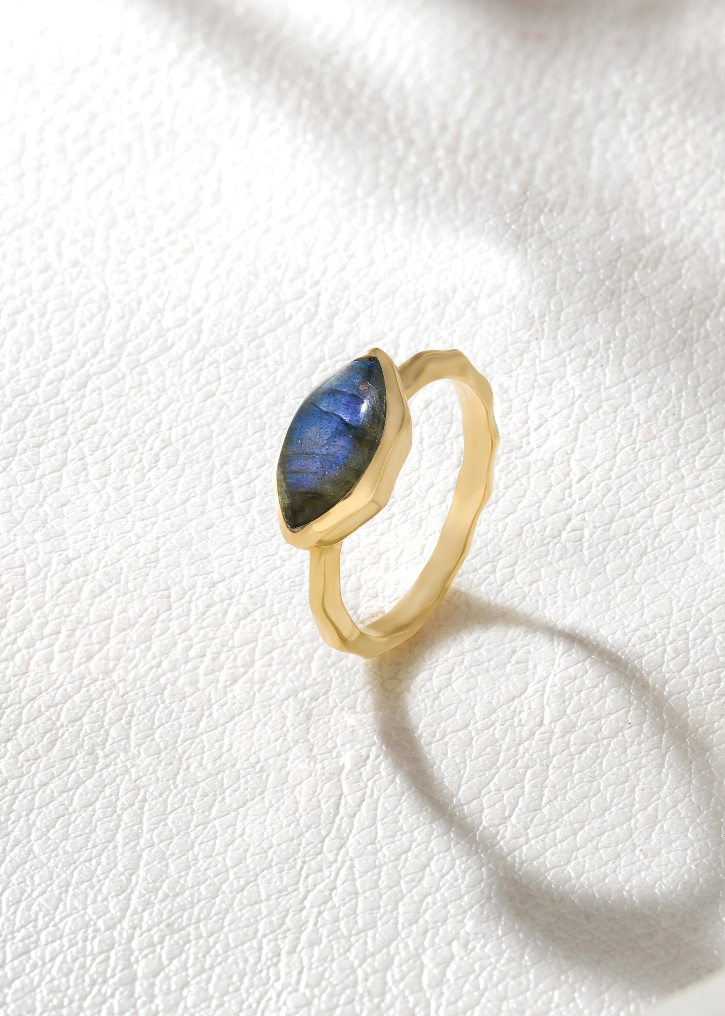 Mysterious and captivating, this wave band ring highlights a marquise-cut Labradorite known for its mesmerizing flashes of blue and green fire. Framed in warm 14K gold plating over sterling silver, the softly contoured band flows naturally around the finger, enhancing the stone’s elongated silhouette. Elegant yet modern, this ring brings a touch of magic to both everyday looks and special moments.