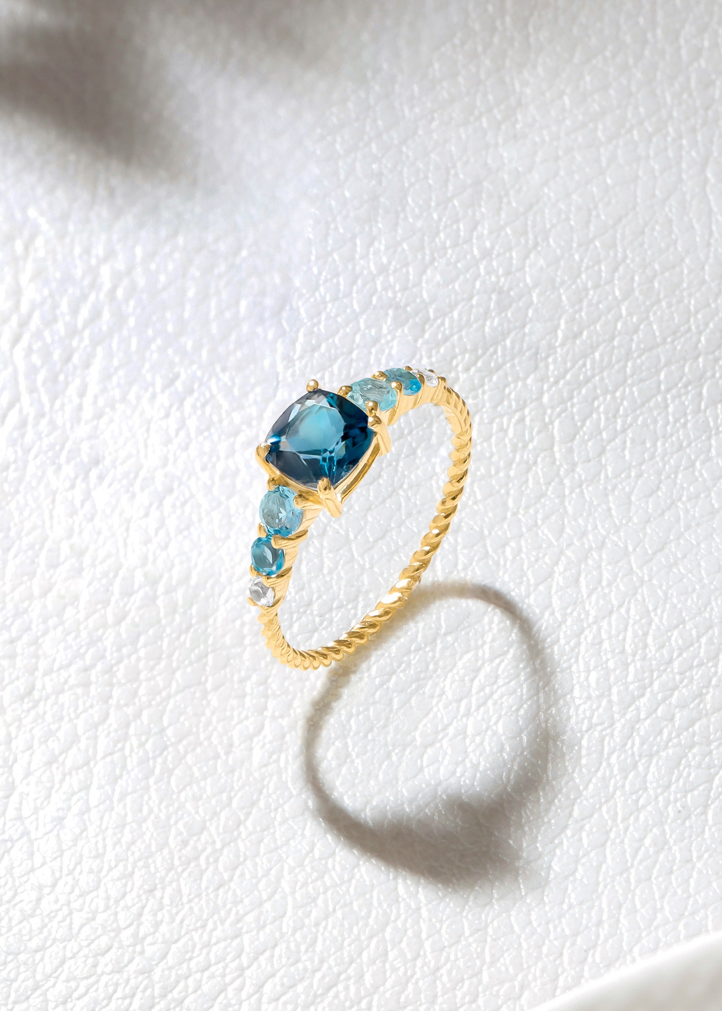 Elegant with a romantic twist, this 14K Gold Plated 925 Sterling Silver Ring features a striking London blue topaz centerpiece accented by sparkling white topaz side stones. Set along a beautifully twisted band, the design adds texture and movement while enhancing the brilliance of the gemstones. The warm gold-plated finish perfectly complements the rich blue tones, making this ring a refined choice for everyday elegance or special occasions.