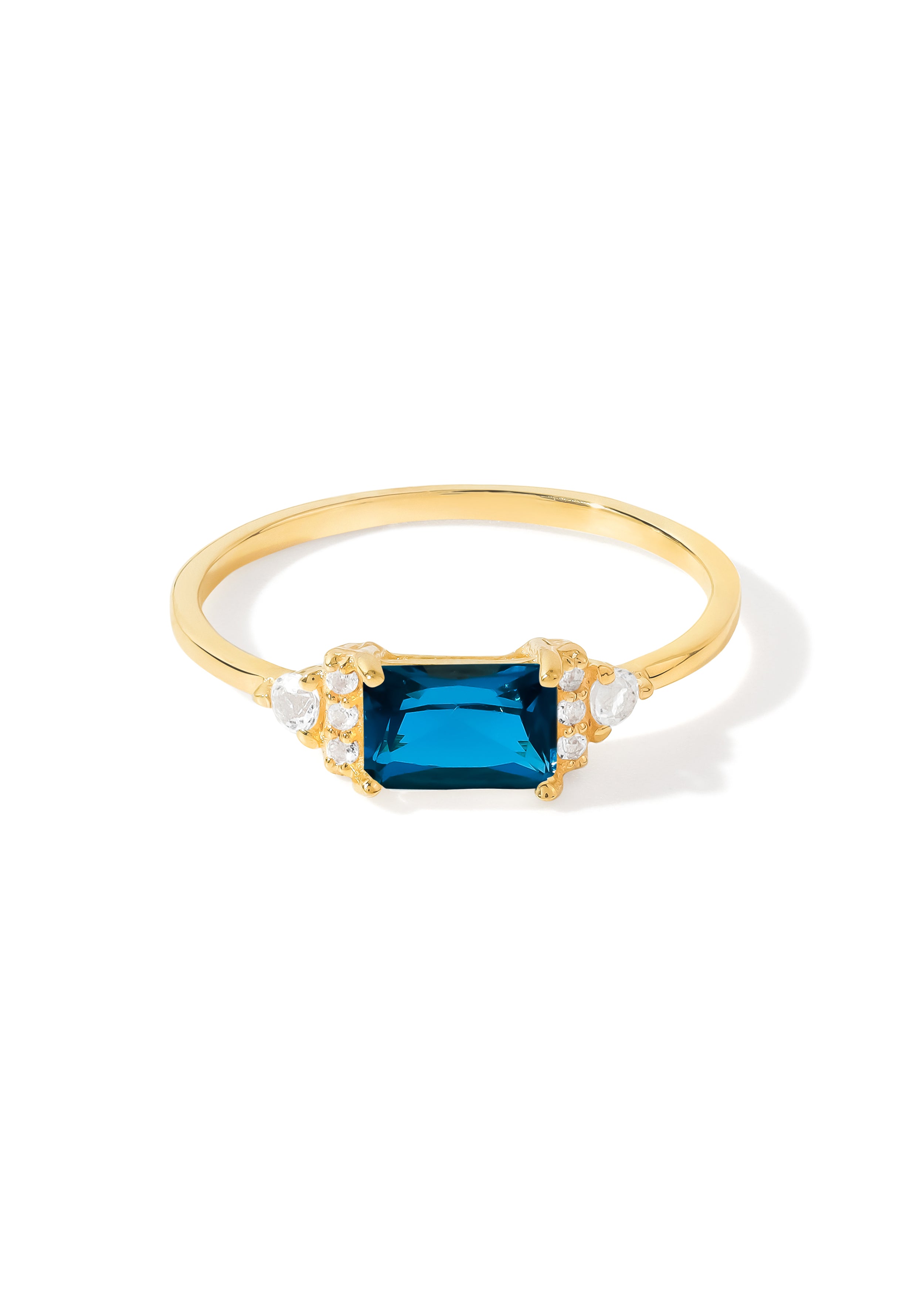 Striking yet timeless, this solitaire-style ring showcases a vivid emerald-cut London Blue Topaz at the center, celebrated for its deep oceanic hue and crisp facets. Sparkling white topaz accents frame the centerpiece, adding brilliance and balance to the design. Finished in warm gold plating over sterling silver, the slim band enhances the stone’s presence while keeping the look refined and effortlessly elegant