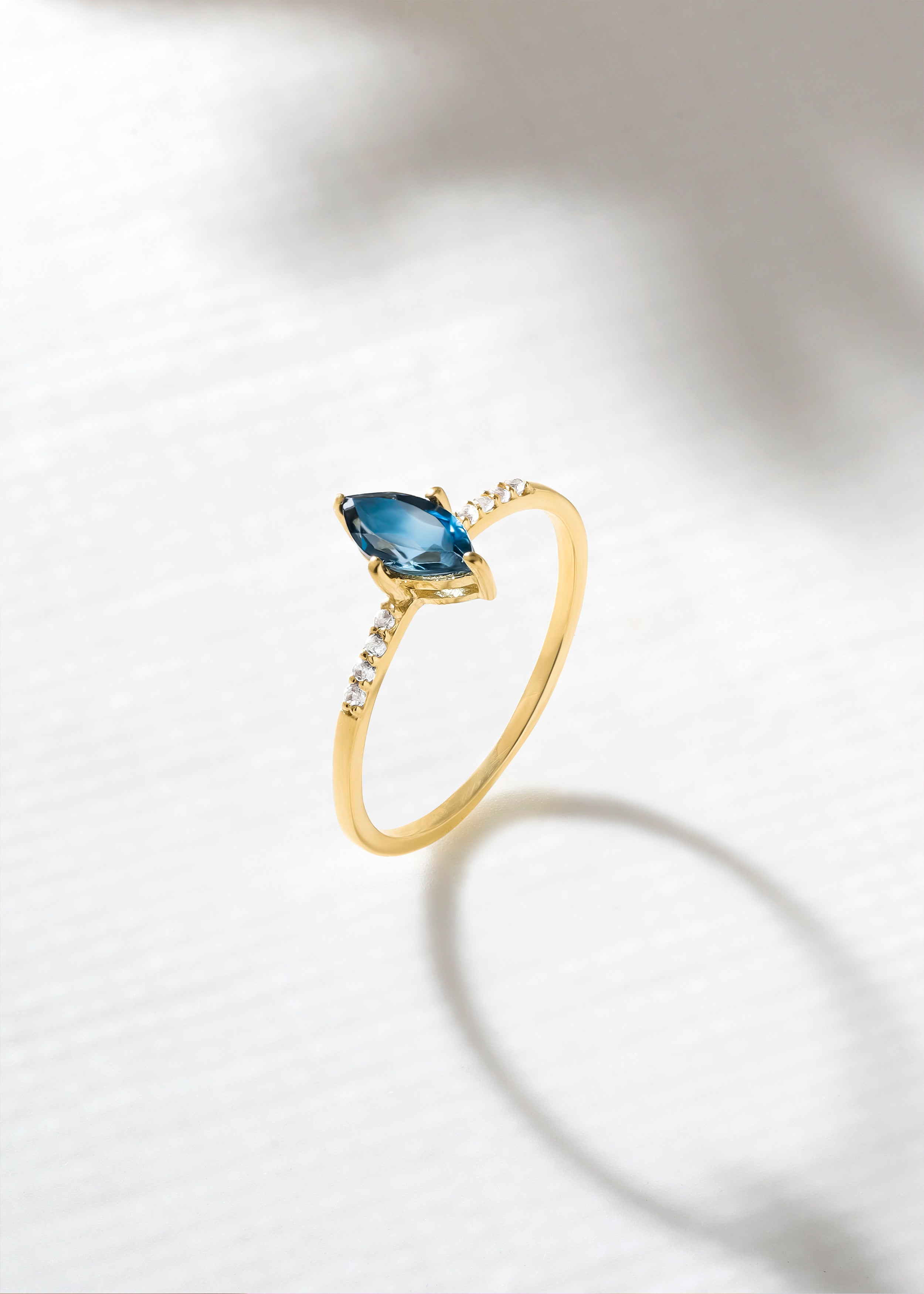 Deep, mesmerizing, and undeniably regal, the Ocean Royale Ring features a marquise-cut London blue topaz that echoes the rich hues of the ocean at dusk. Framed with sparkling white topaz accents, the design captures light with every movement. Finished in luminous gold plating over sterling silver, this ring delivers timeless sophistication with a bold, refined edge—perfect for statement moments and everyday luxury alike.