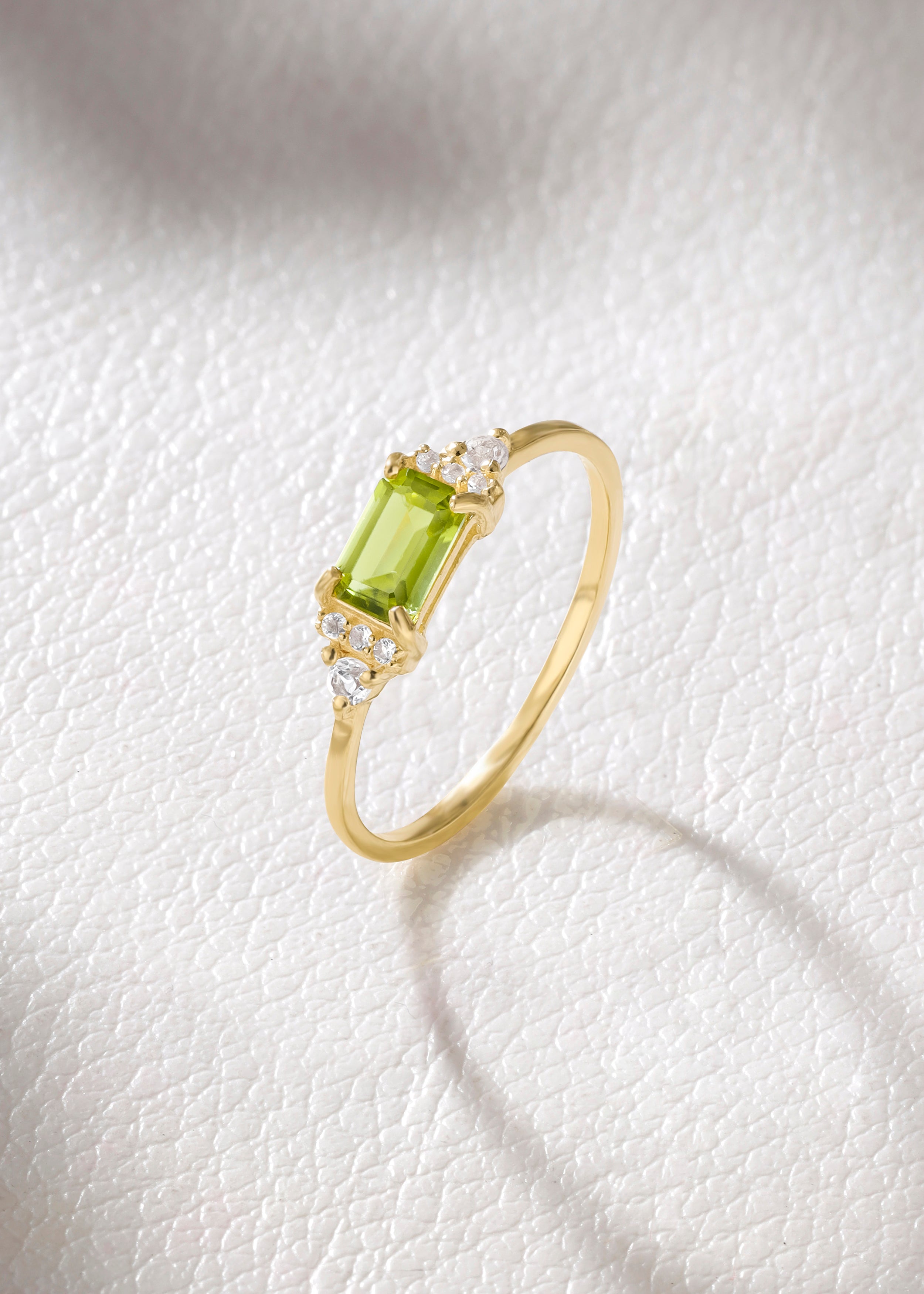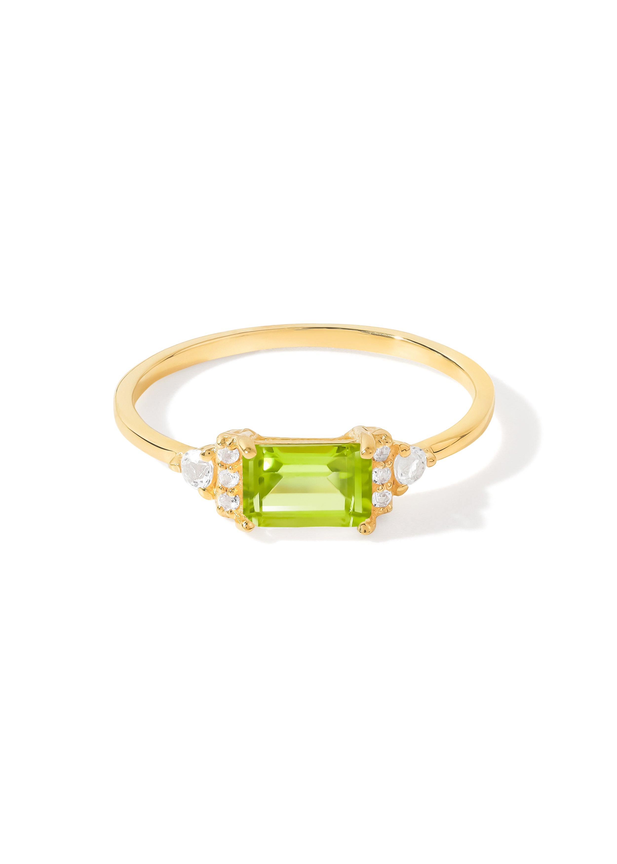 Vibrant and refreshing, this ring features a luminous peridot gemstone known for its lively green glow. Accented with sparkling white topaz, the design creates a beautiful contrast that catches the light effortlessly. Finished in warm gold plating over sterling silver, this ring brings a touch of natural elegance to both everyday looks and special occasions..