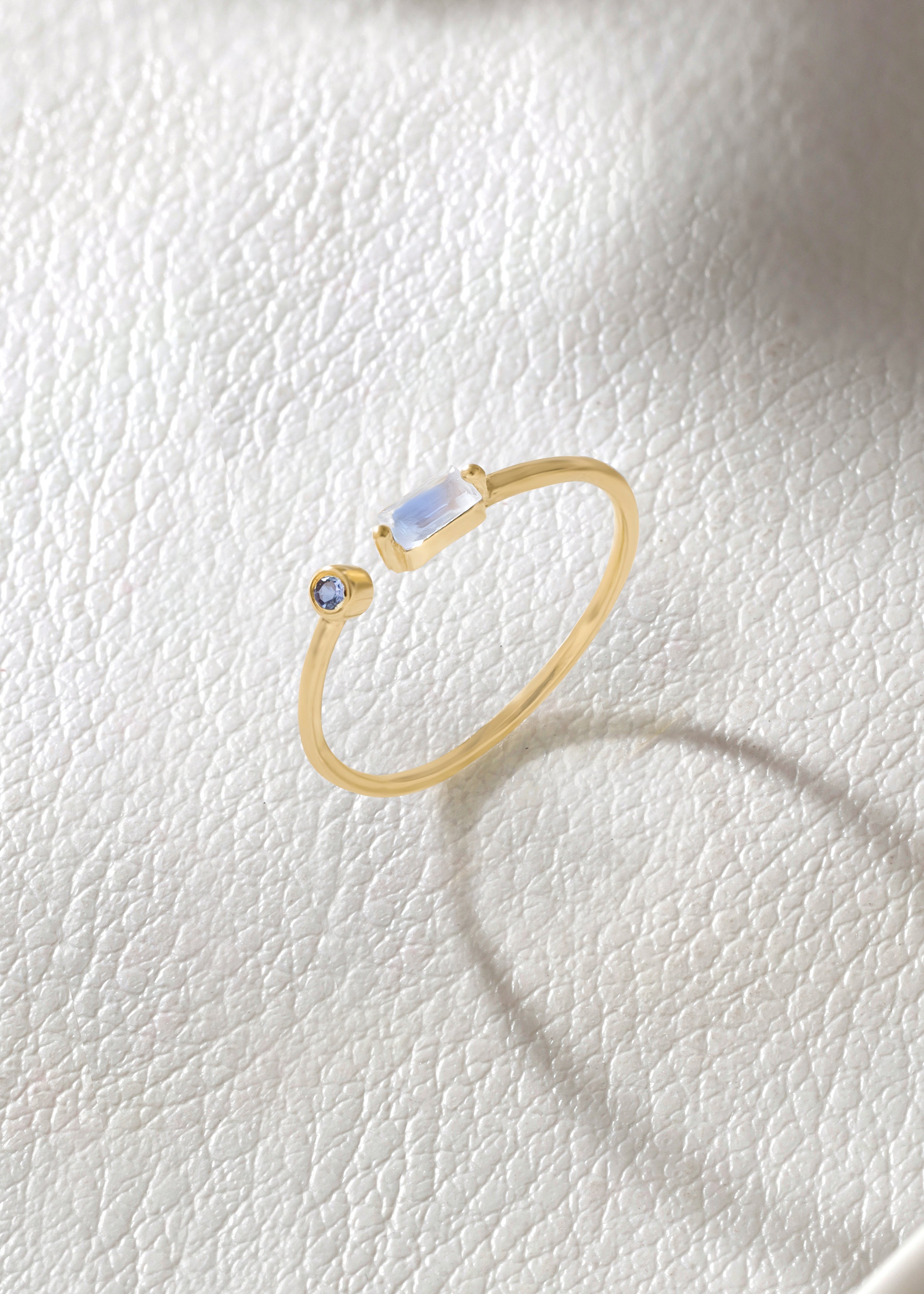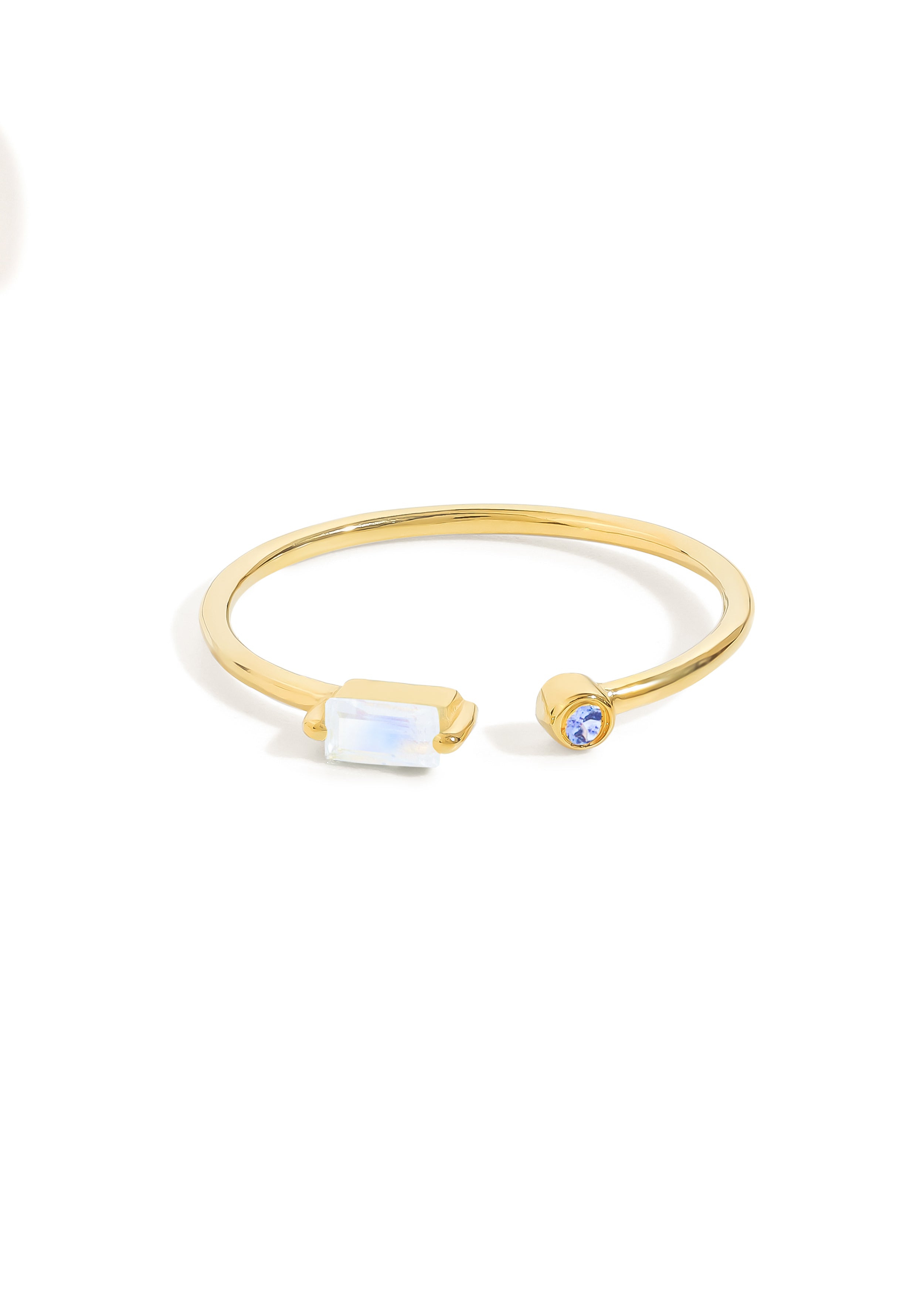 The mystical glow of rainbow moonstone is paired with a touch of vibrant tanzanite. The open-ended silhouette creates a light, modern feel, making it perfect for everyday elegance or effortless stacking.