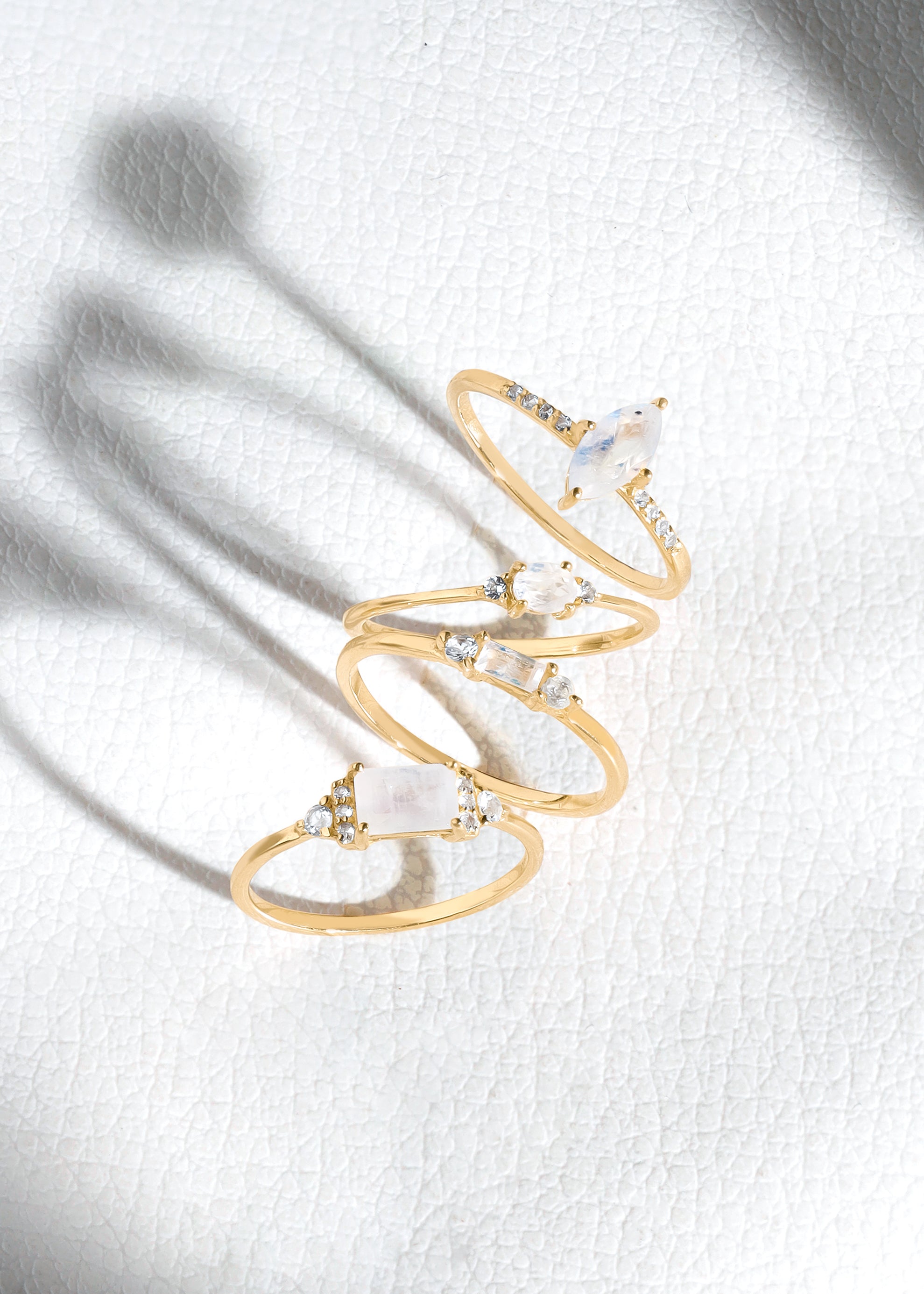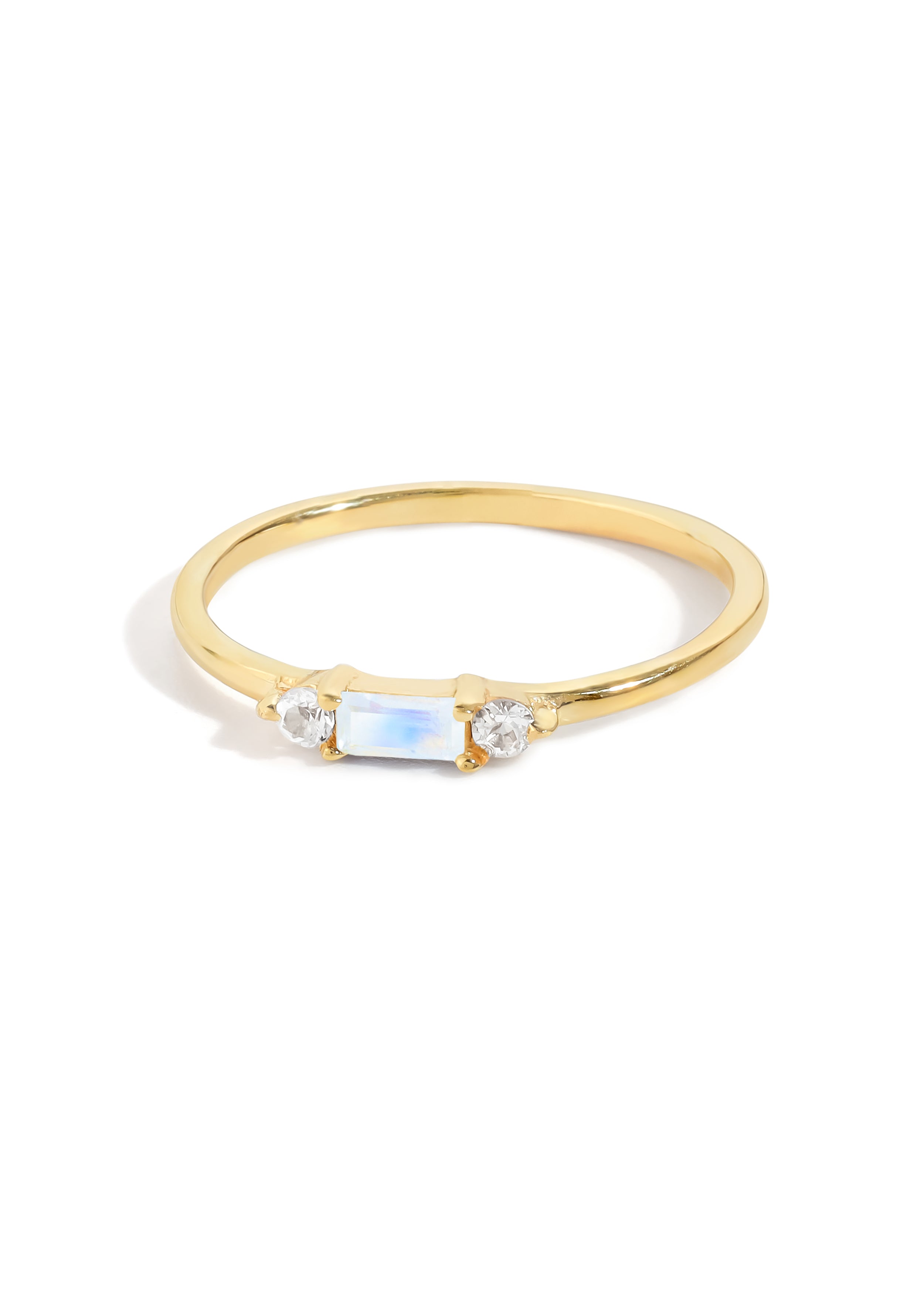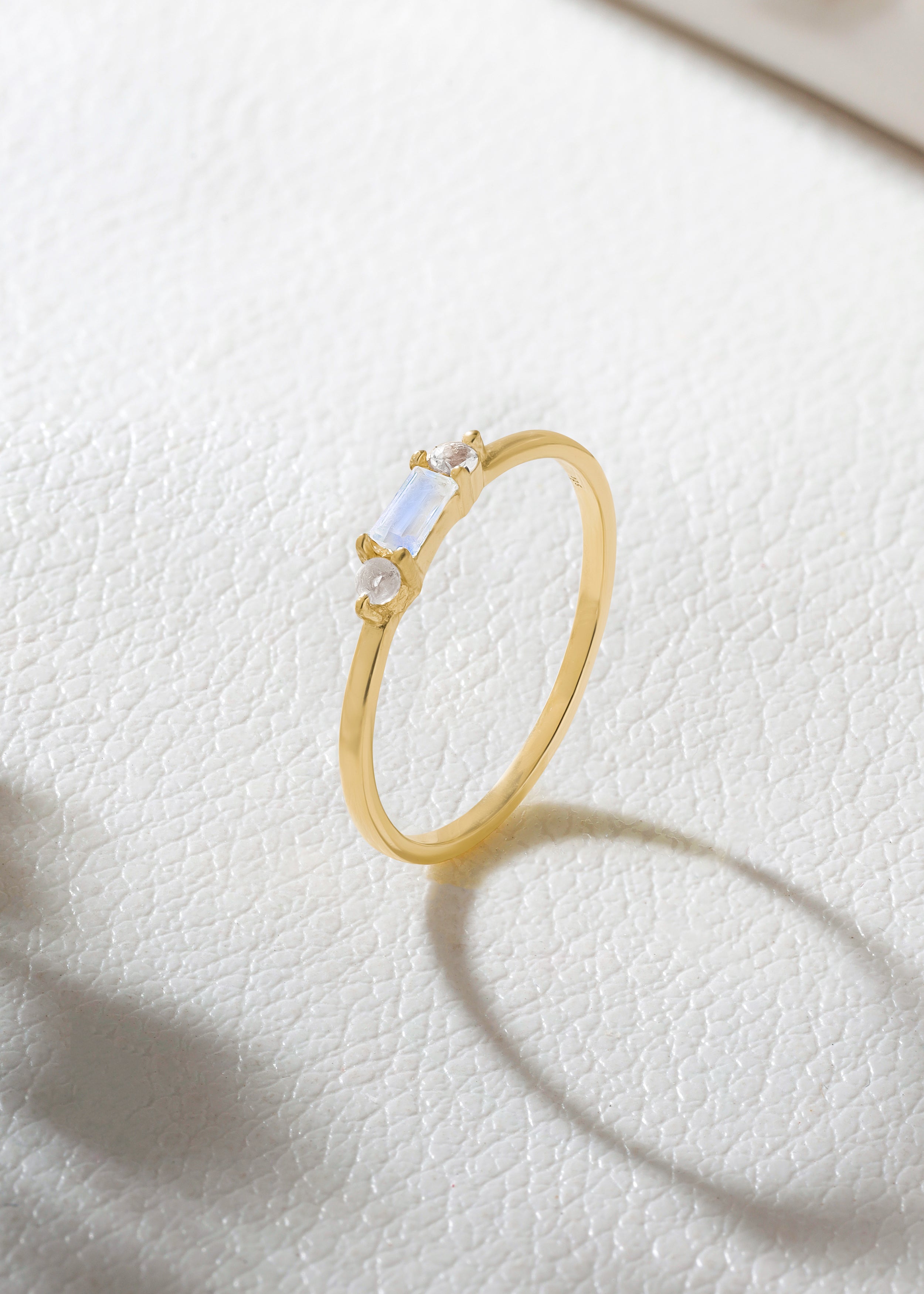 This delicate Rainbow Moonstone ring brings a soft, dreamy glow to your everyday look. Featuring a baguette-cut moonstone flanked by two sparkling White Topaz stones, it creates a subtle shimmer with each movement.