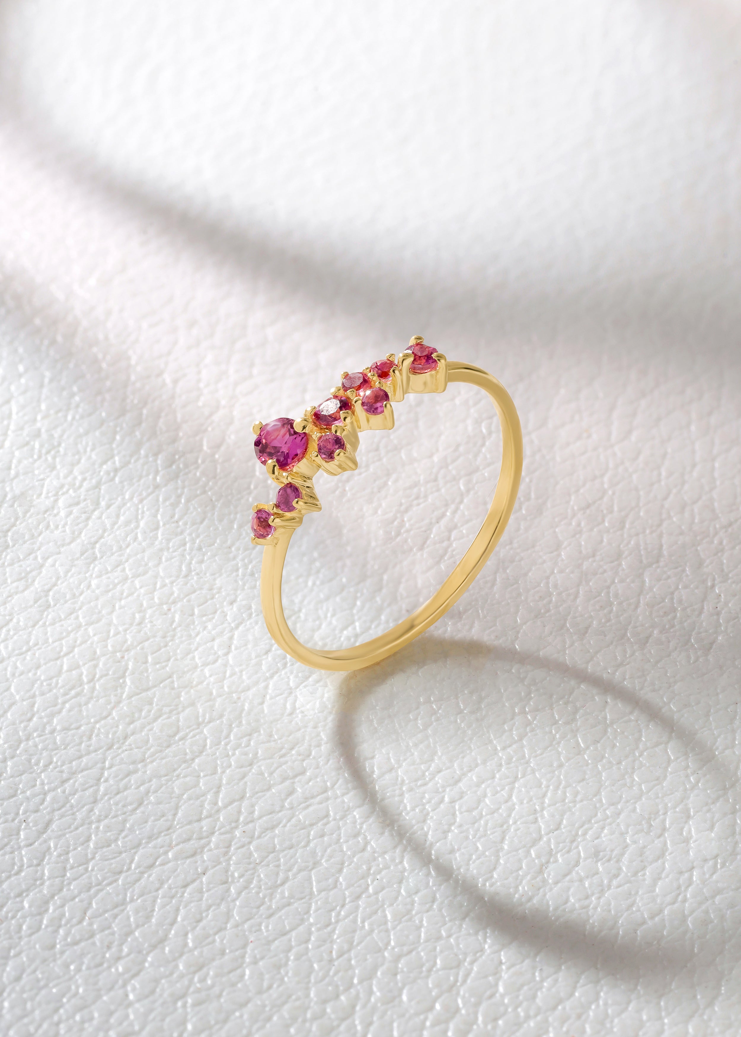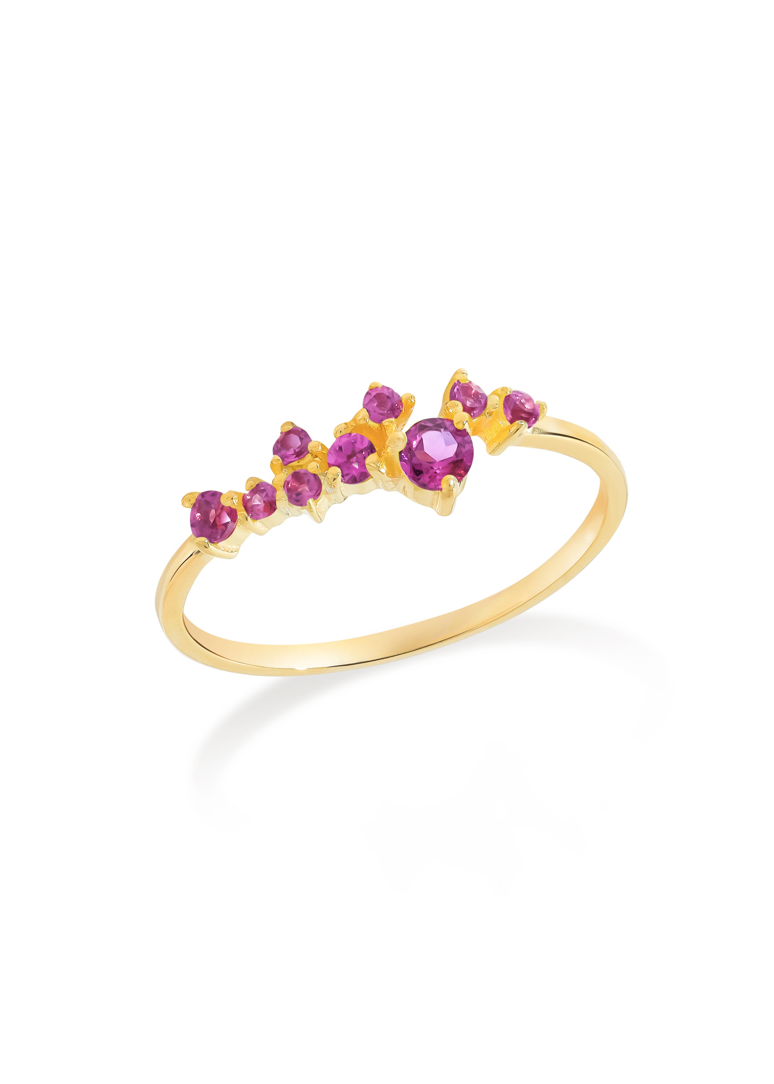 Graceful and richly hued, this cascade ring features a flowing arrangement of rhodolite garnet stones that shimmer with deep rose-red tones. Set in warm 14K gold plating over sterling silver, the cascading design creates elegant movement and eye-catching sparkle. Delicate yet striking, this ring adds a touch of romance and sophistication to both everyday wear and special occasions.