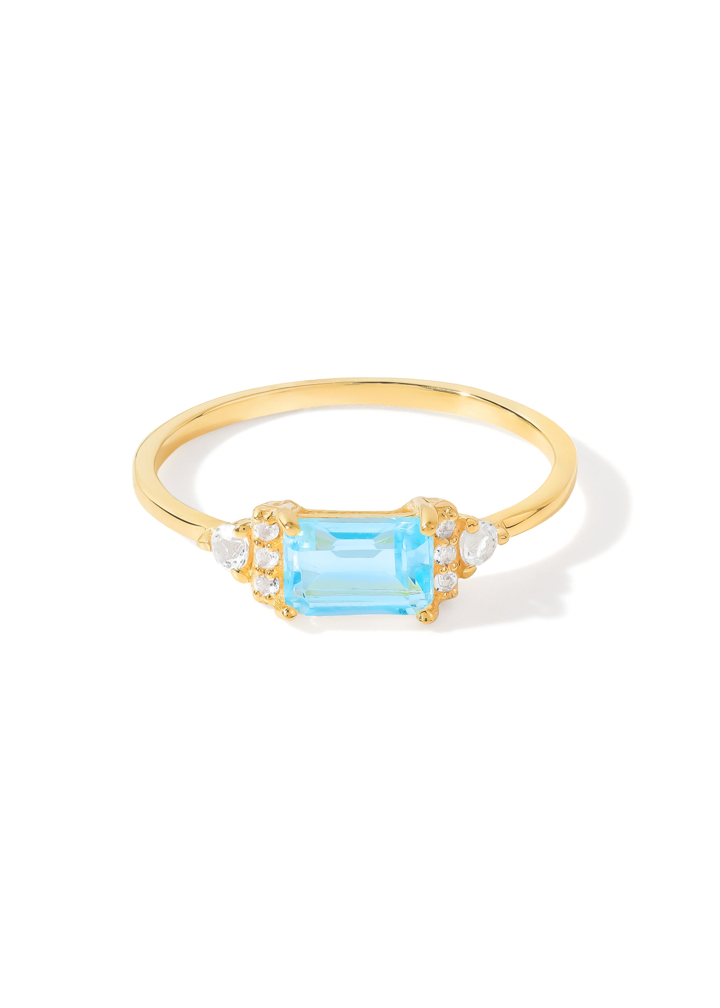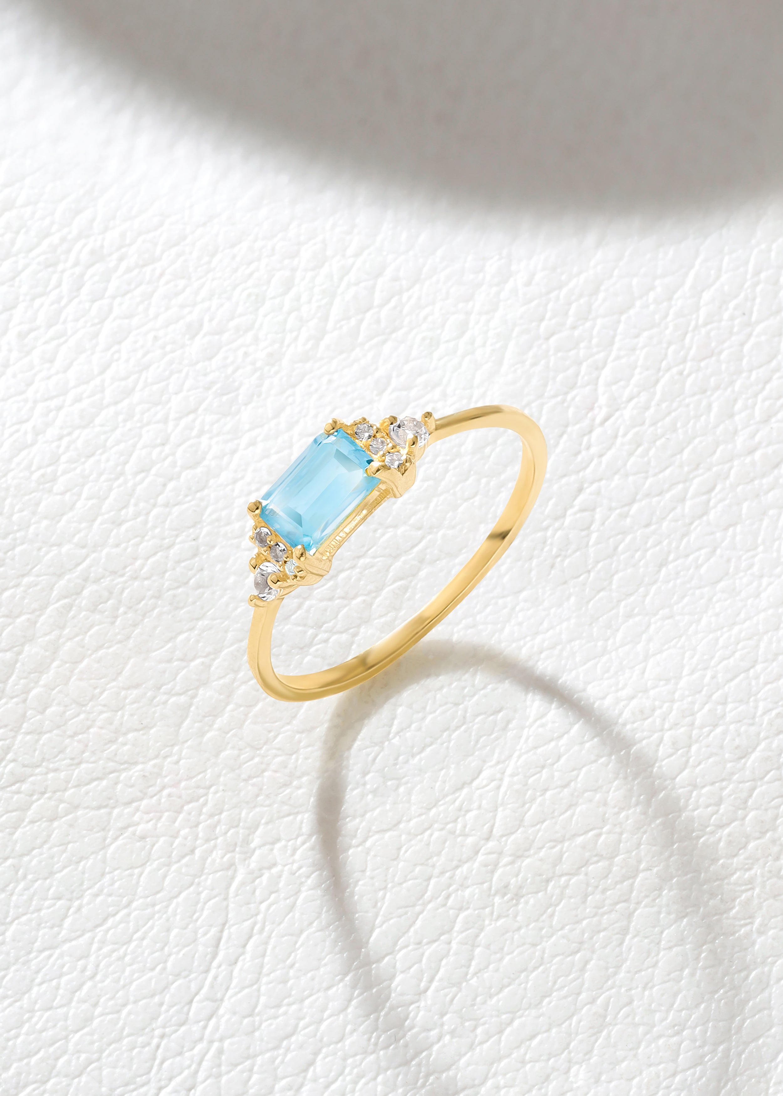 Bright, refreshing, and effortlessly elegant, this ring showcases a radiant sky blue topaz that captures the clarity of open skies. Accented with shimmering white topaz, the design reflects light beautifully with every movement. Finished in rich gold plating over sterling silver, this piece adds a graceful pop of color, perfect for everyday wear or special moments.
