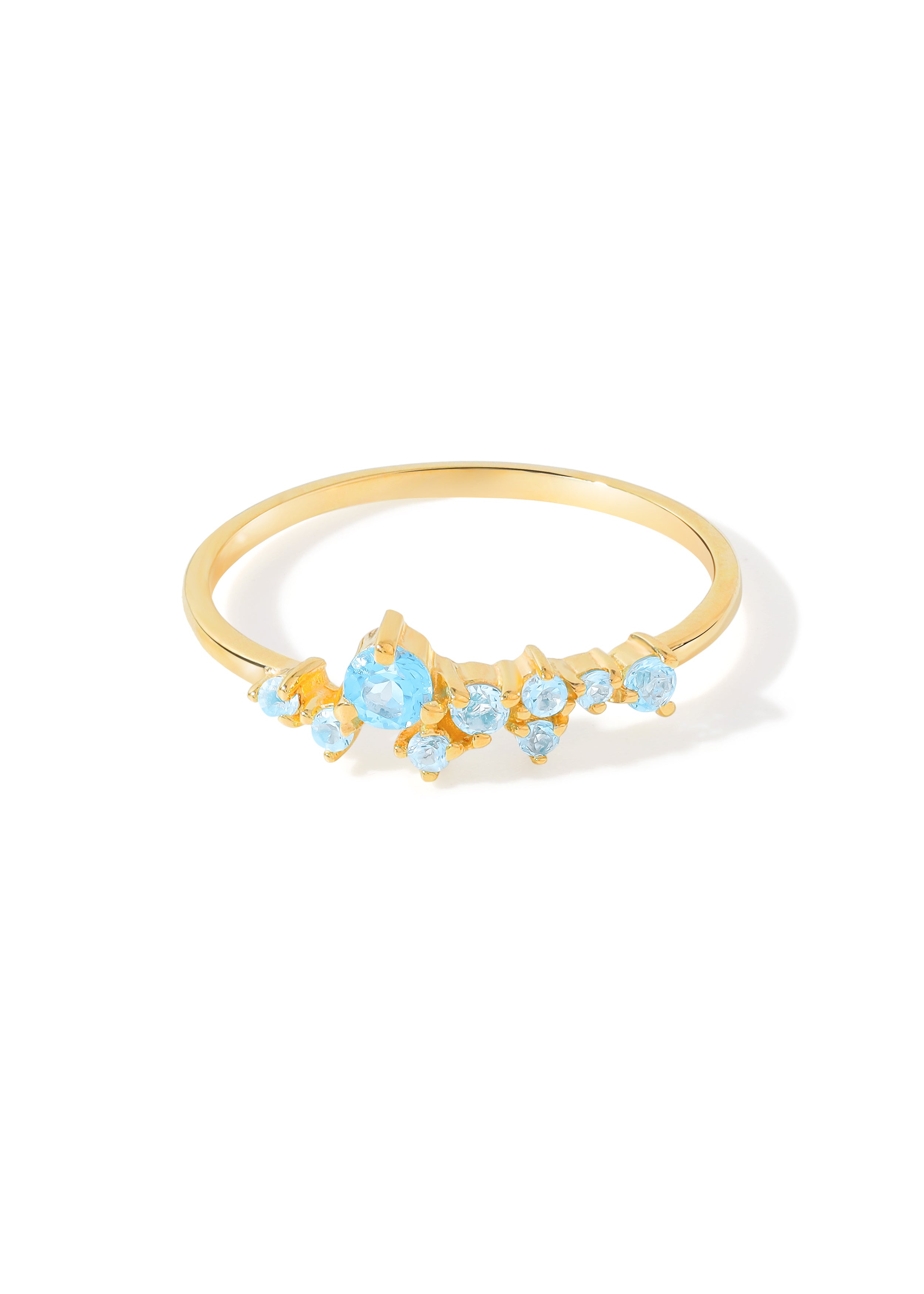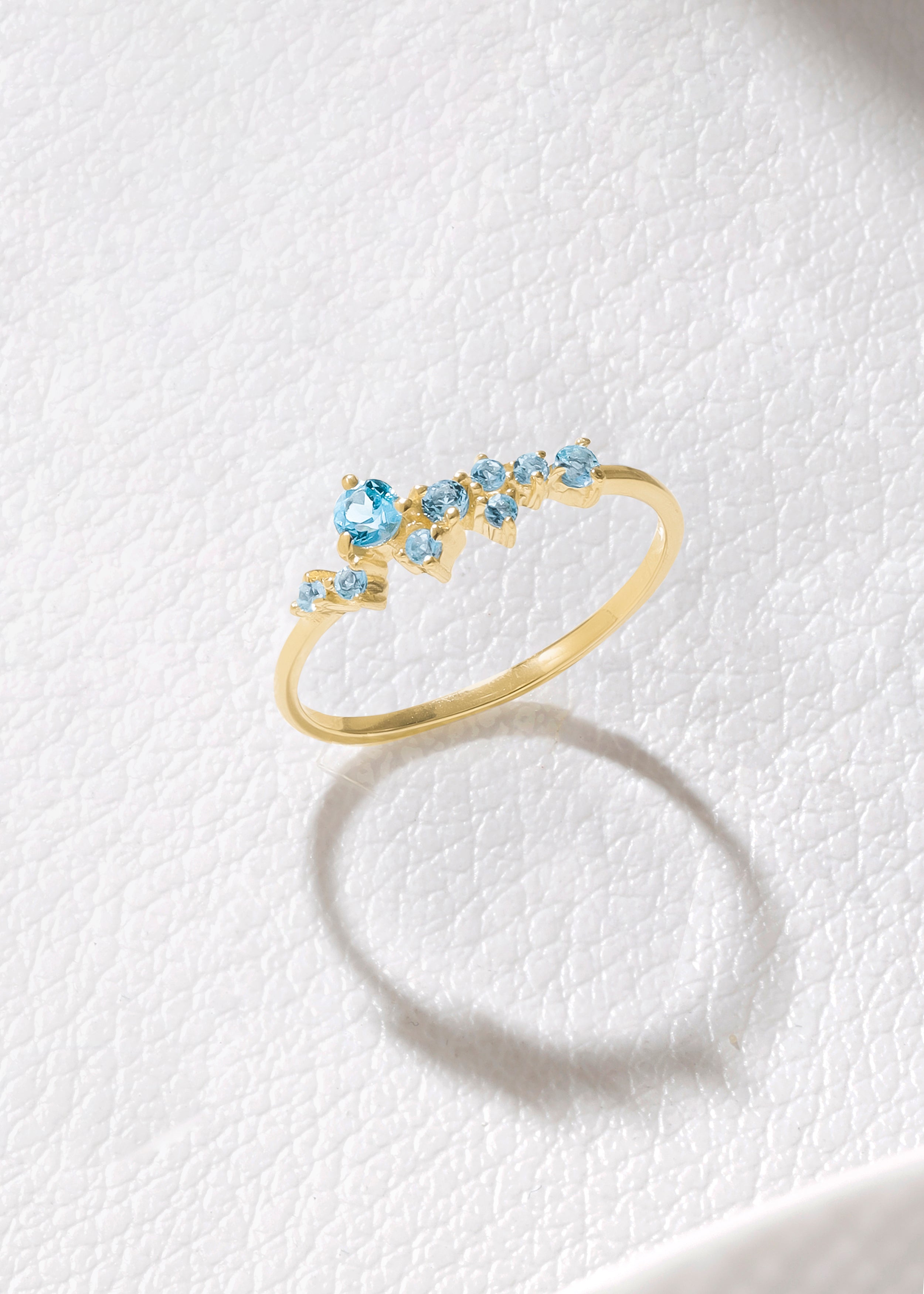 Light, fluid, and beautifully radiant, the Azure Cascade Ring features a graceful trail of Swiss blue topaz stones that shimmer like drops of clear blue water. Set in warm 14K gold plating over sterling silver, the cascading design creates soft movement and sparkle with every gesture. Delicate yet eye-catching, this ring is perfect for adding a refined pop of color to both everyday looks and special occasions.