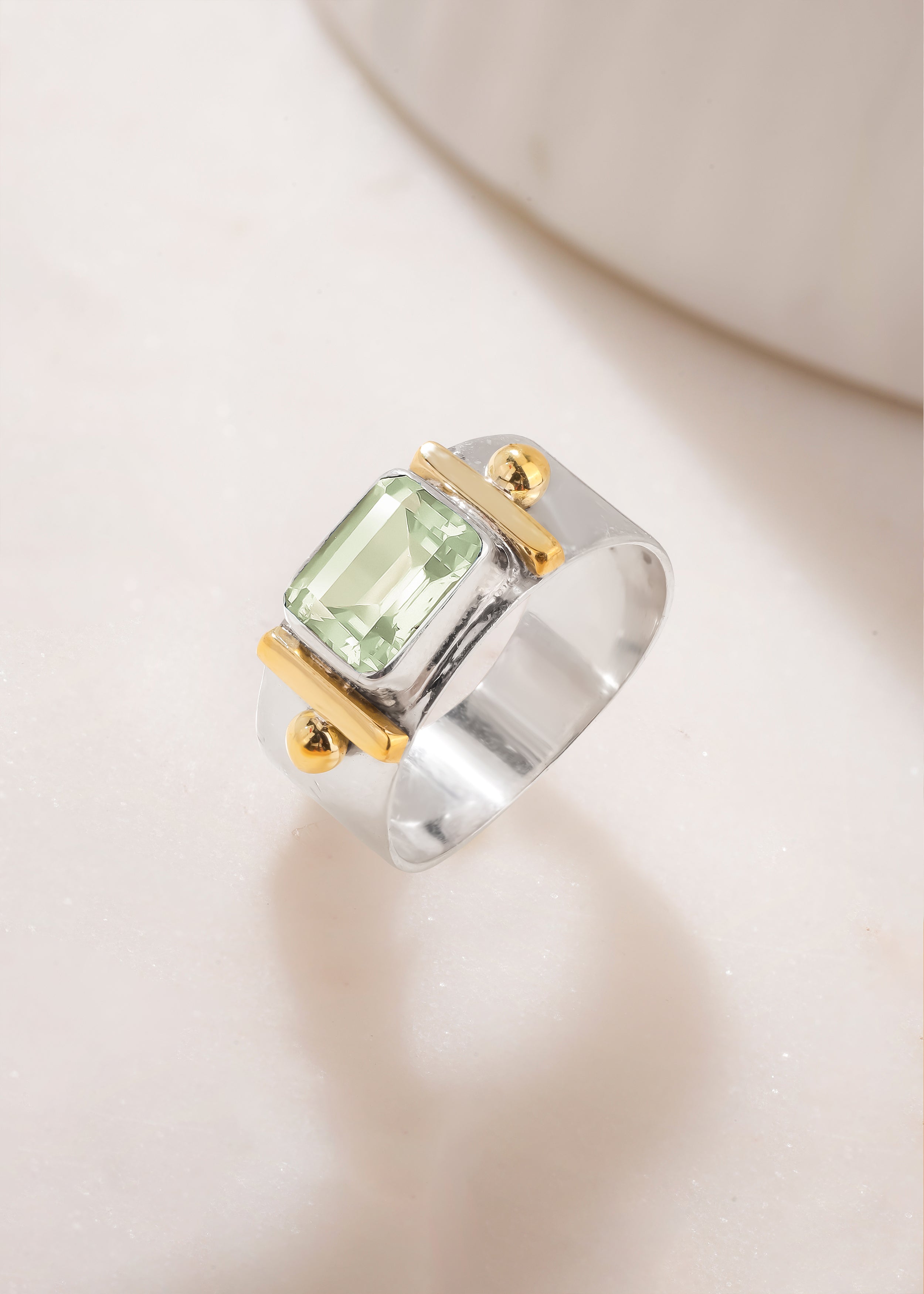 Bold and contemporary, this Solid 925 Sterling Silver & Brass Green Amethyst Ring features a striking emerald-cut green amethyst set in a clean, architectural frame. The wide sterling silver band is accented with warm brass detailing, creating a refined contrast that enhances the gemstone’s soft green brilliance. With its structured silhouette and handcrafted texture, this ring is designed for those who appreciate modern statement jewelry with artisanal character.