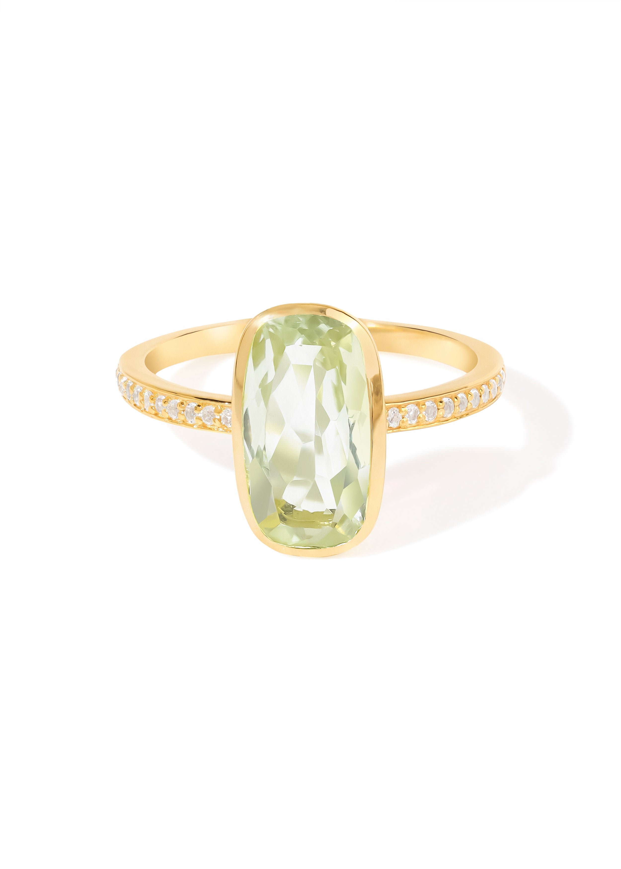 Add a touch of fresh elegance to your jewelry collection with this YoTreasure Green Amethyst & White Topaz Ring. Beautifully crafted in 14K gold plated over 925 sterling silver, this refined piece showcases a luminous green amethyst at the center, accented by sparkling white topaz that enhances its natural brilliance.