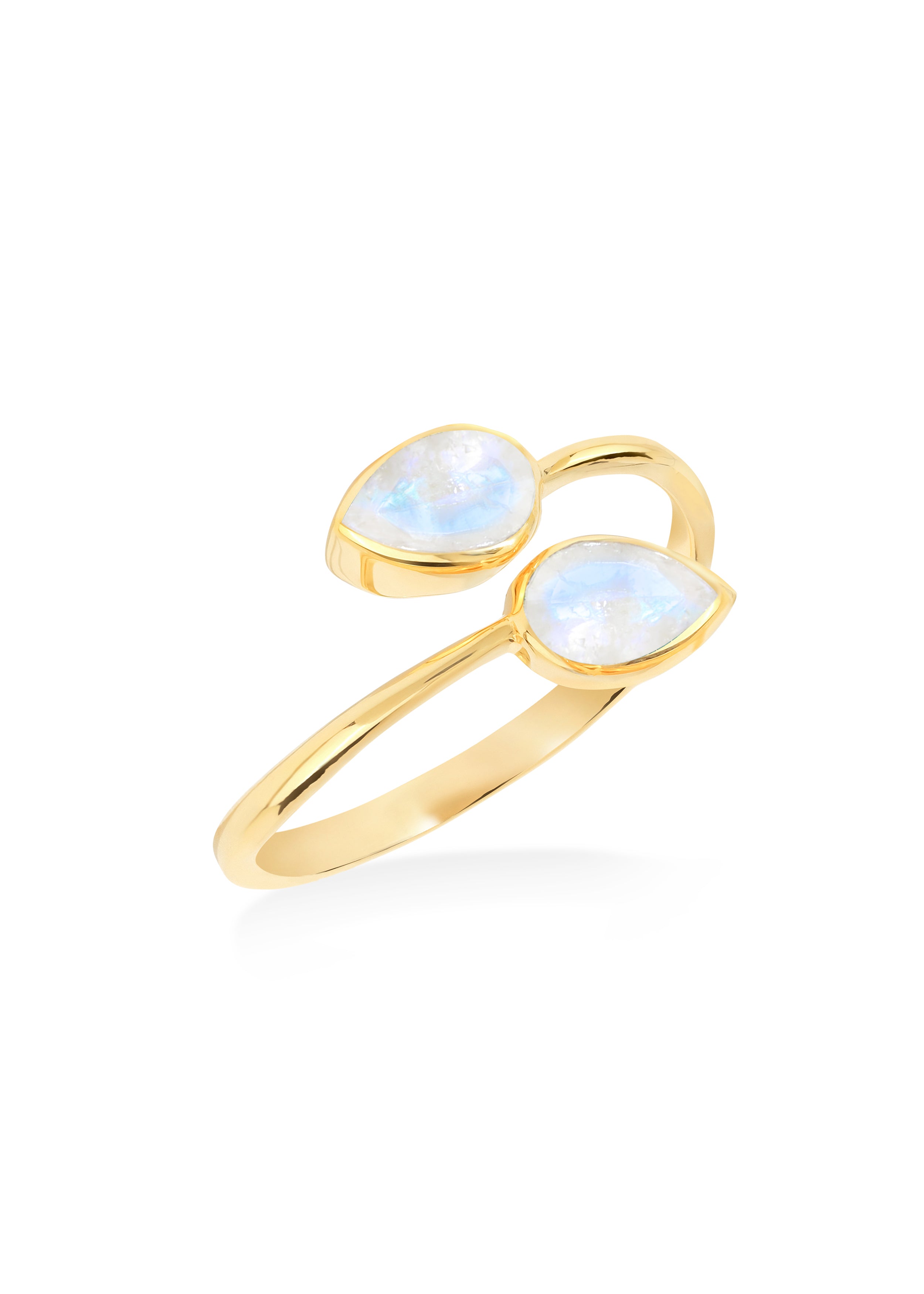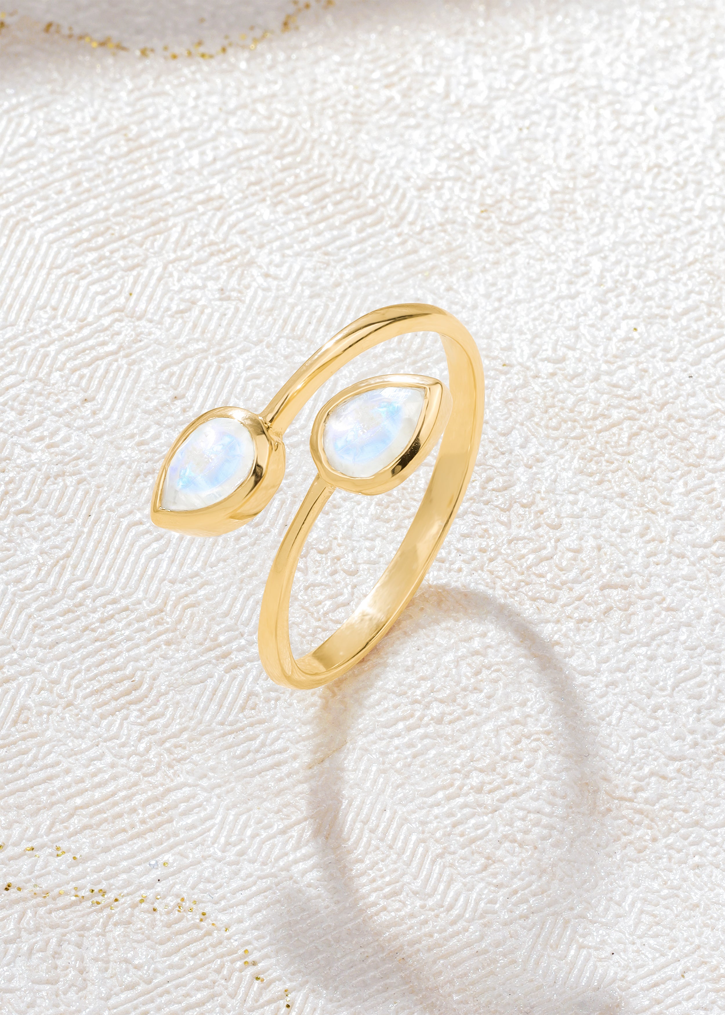 Embrace celestial elegance with this Rainbow Moonstone Bypass Ring, expertly crafted in 925 Sterling Silver and finished with radiant solid 14K gold plating. Featuring luminous rainbow moonstones with a natural iridescent glow, this open-band bypass design symbolizes intuition, balance, and feminine energy.