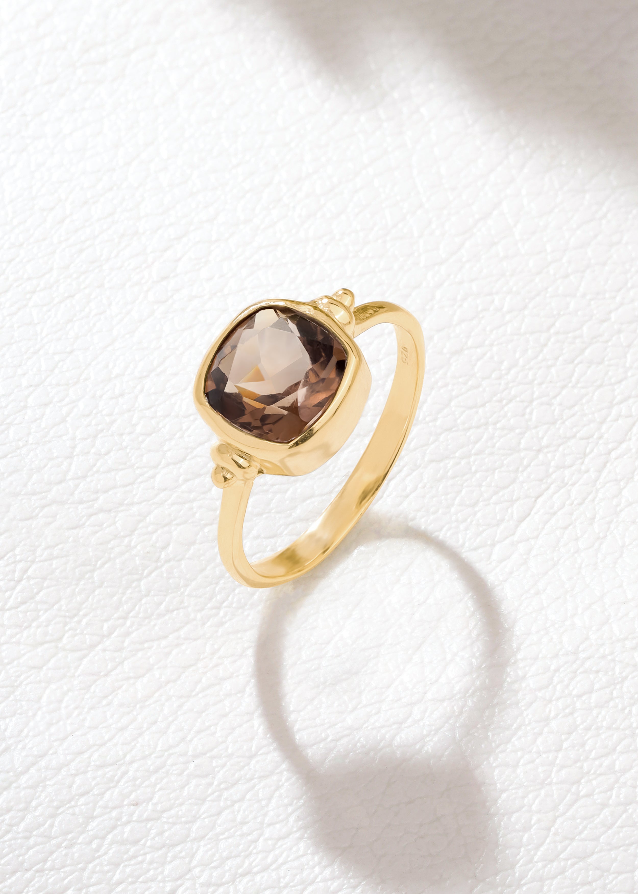 • Features a cushion-cut smoky quartz with warm, smoky brown hues