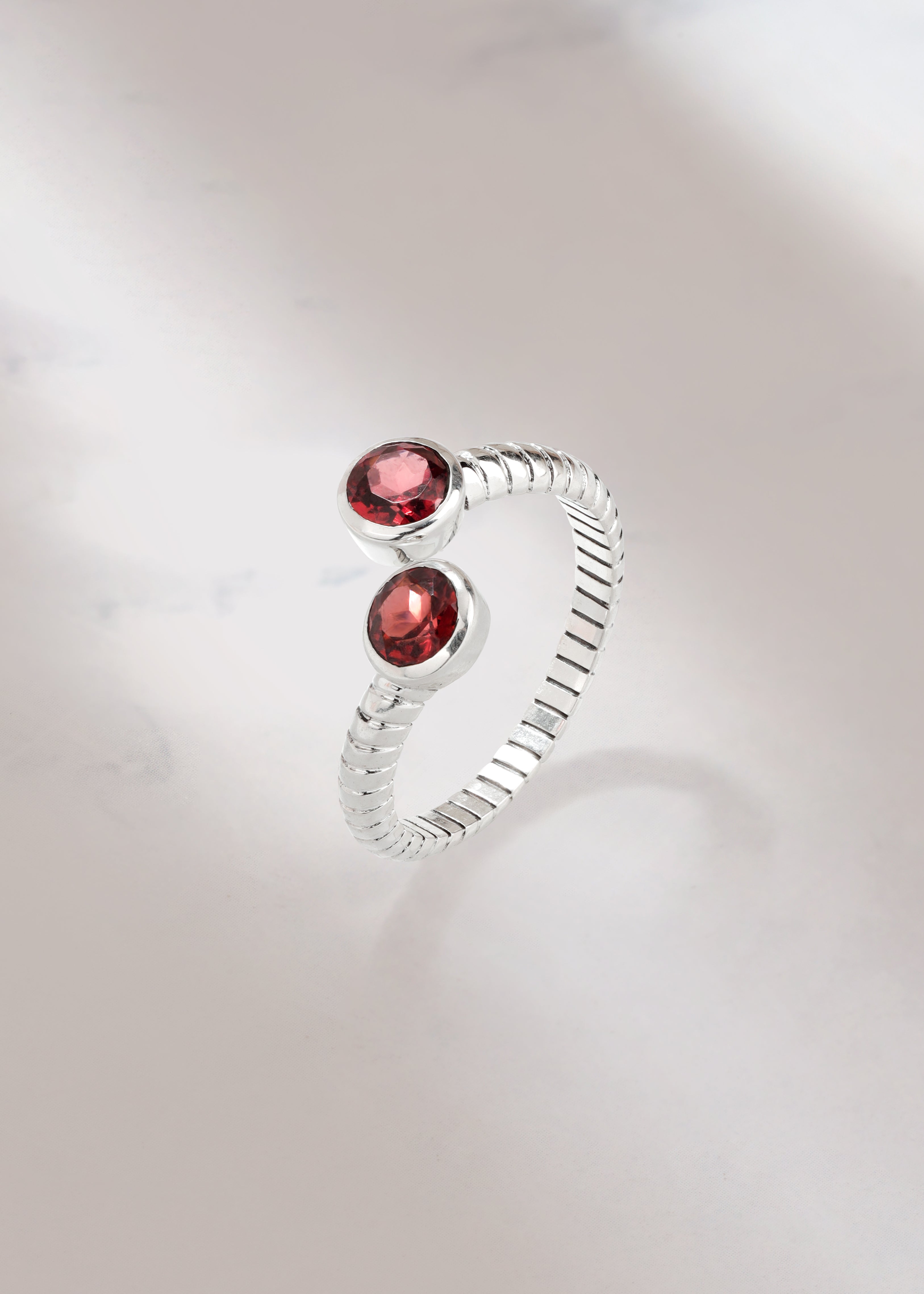 • Showcases two vibrant garnet gemstones in an elegant open band