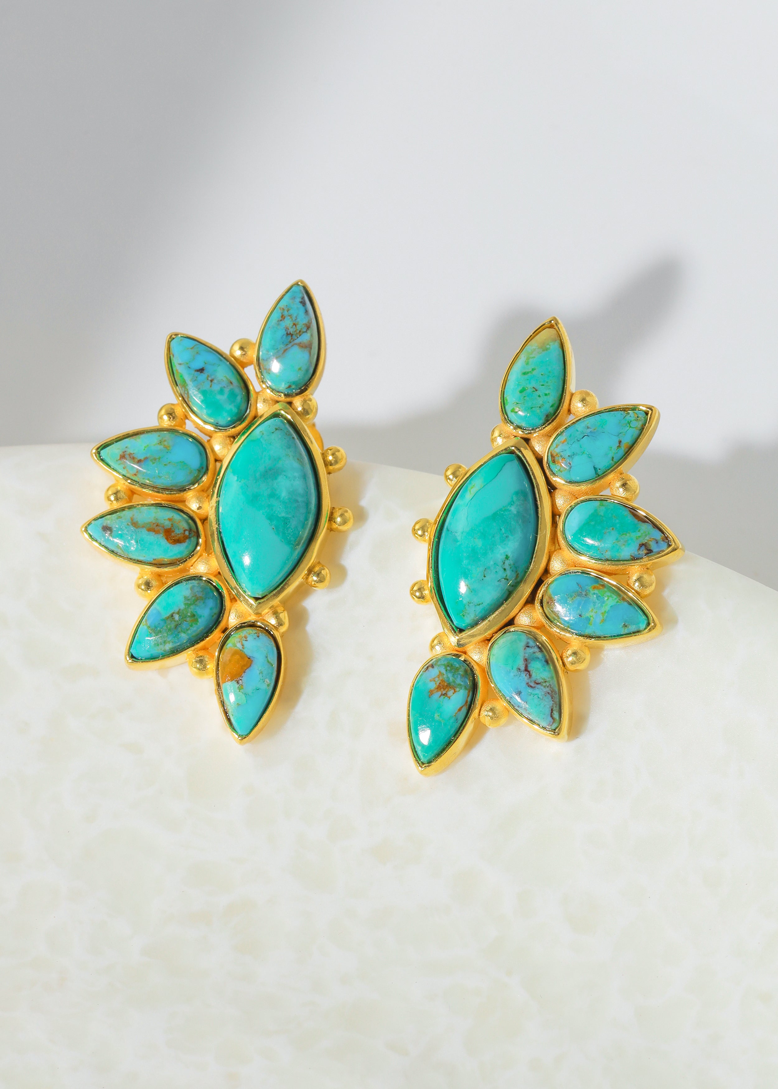 These stunning stud earrings are designed to make a statement while remaining lightweight. They showcase luminous Mohave Turquoise in a sun-inspired arrangement, striking the perfect balance between bold color and elegant design. These earrings are an effortless way to enhance your everyday style with a touch of personality.