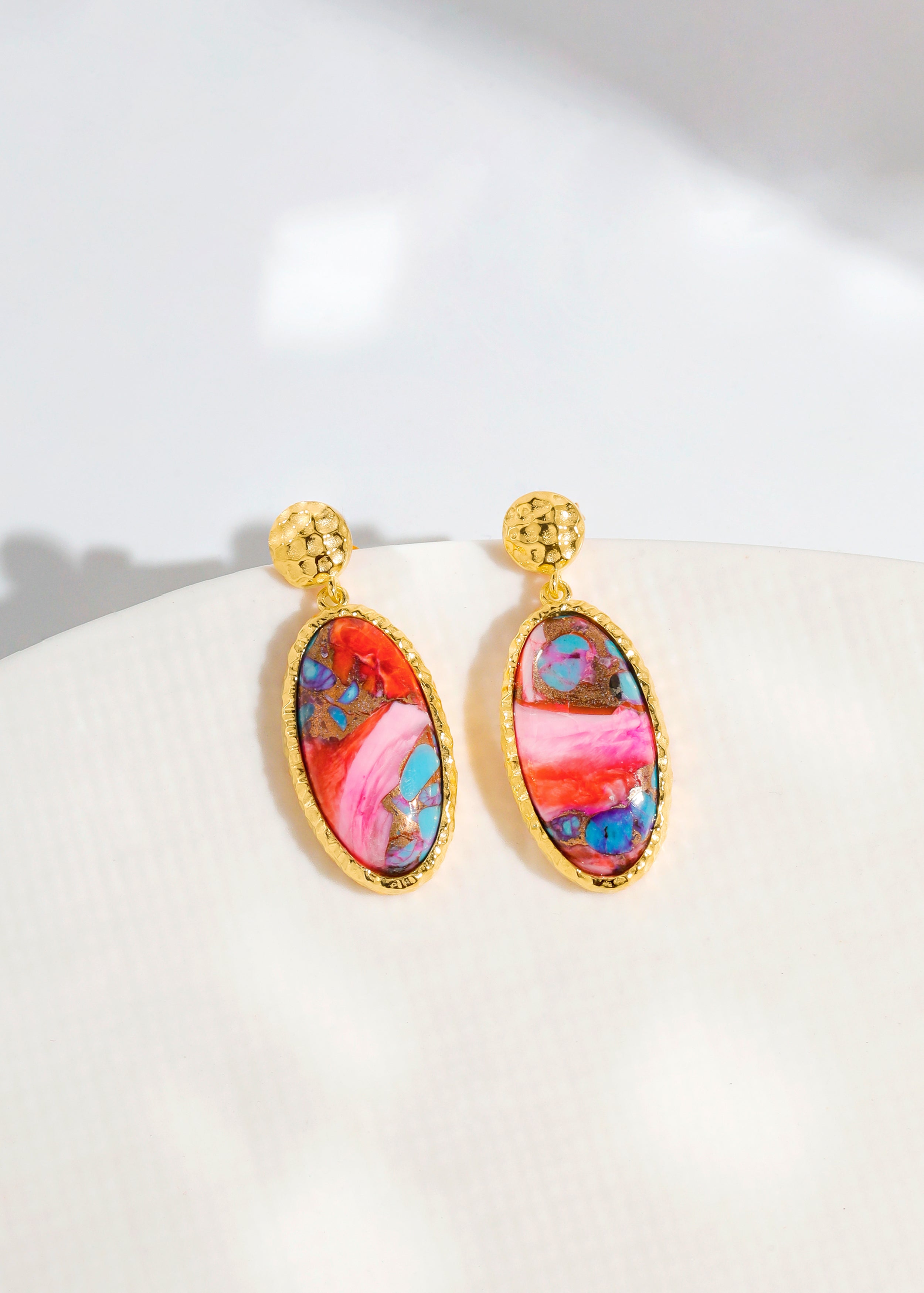 Meet your new everyday statement. Showcasing luminous Pink Oyster Turquoise with natural veining and sun-warmed hues, these oval drop studs are framed in hammered premium brass. Designed to catch the light as you move, they balance everyday ease with bold, standout style.
