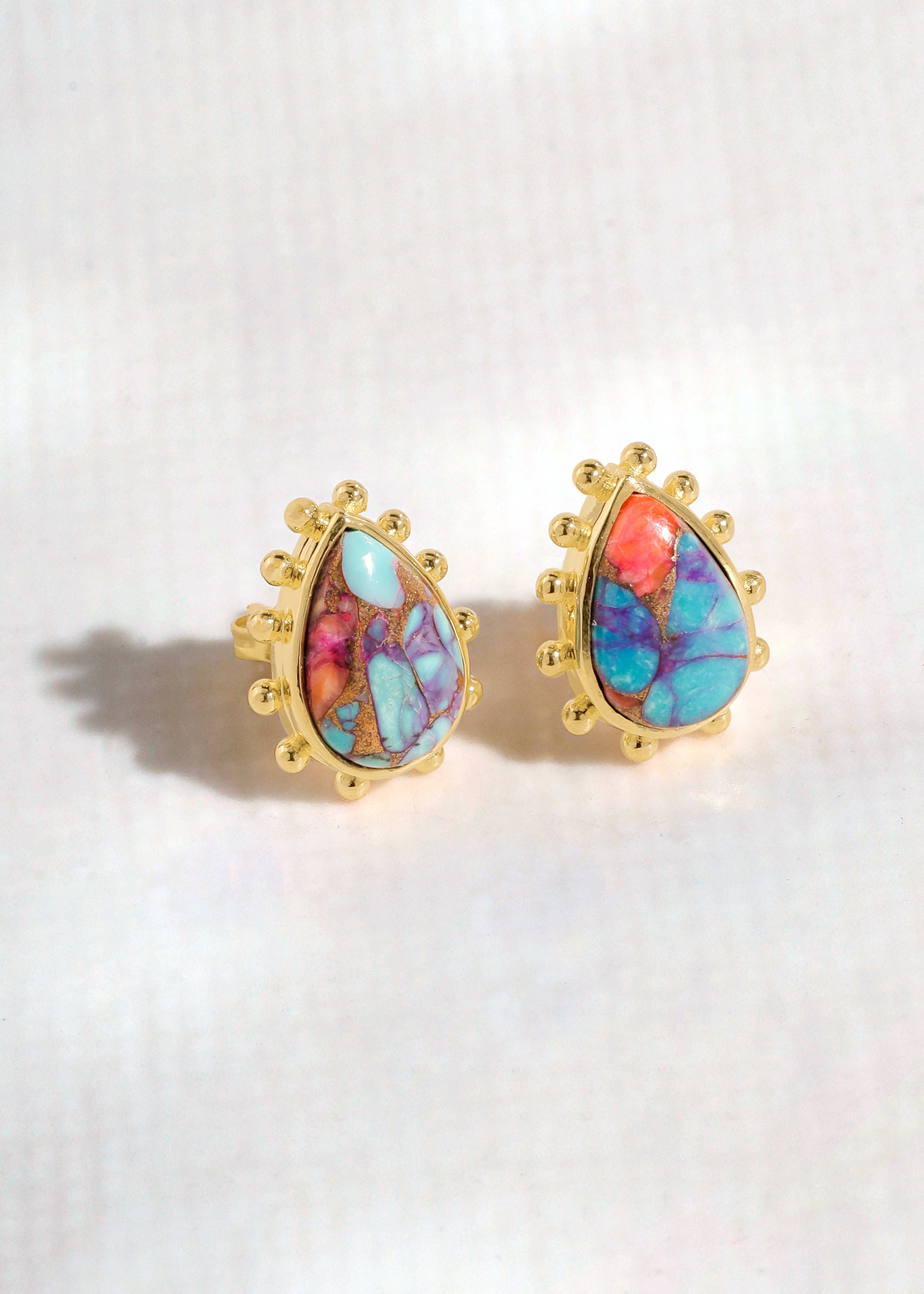 Delicate yet full of character, these pear-shaped stud earrings feature vibrant Pink Oyster Turquoise framed by a softly dotted gold-plated brass border. The natural mosaic of pinks and warm undertones gives each stone its own personality, while the premium brass setting adds a handcrafted, vintage-inspired charm. Lightweight and easy to wear, these studs are perfect for adding a subtle pop of color to everyday looks or elevating casual elegance.