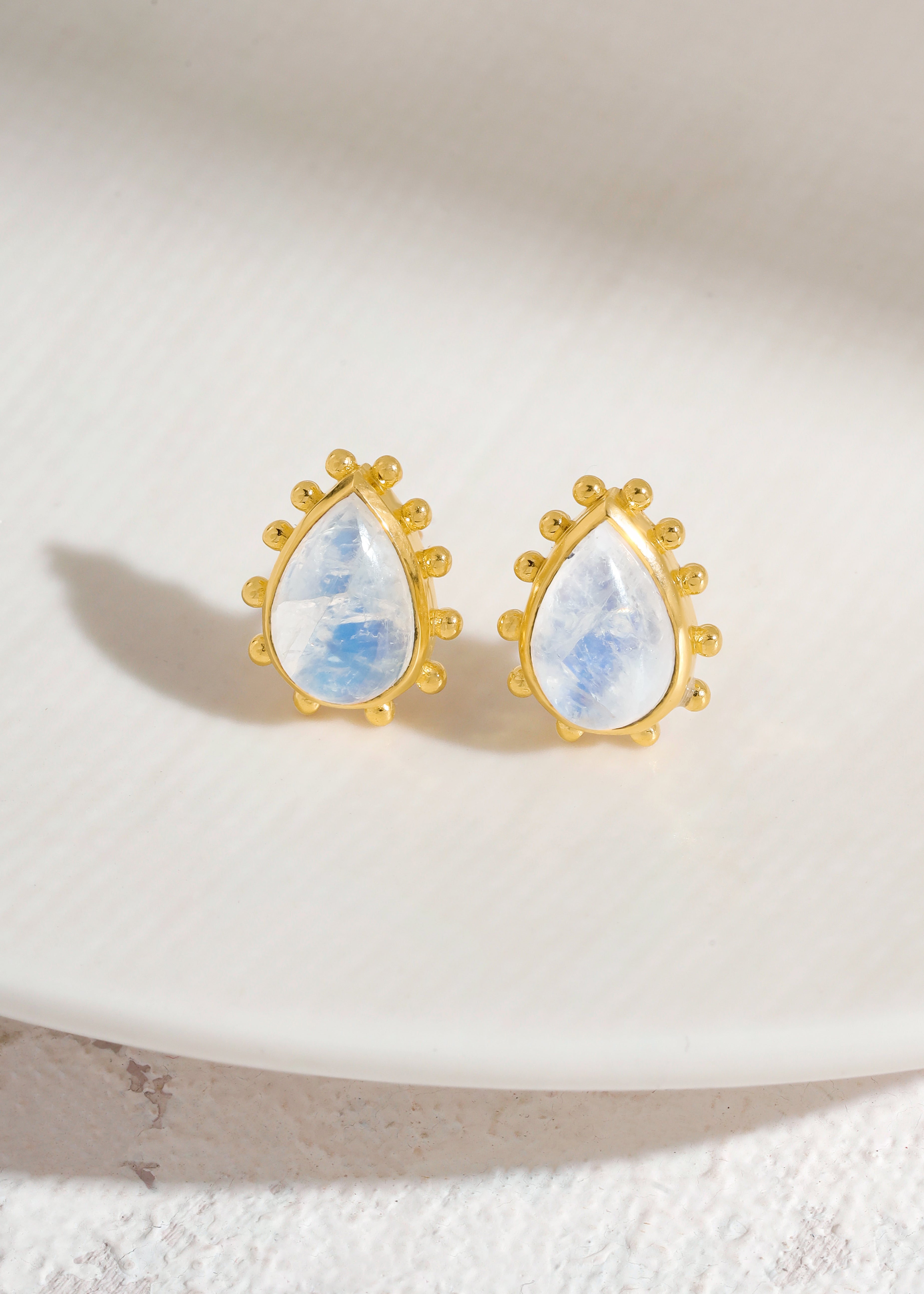 These pear-shaped stud earrings, designed with an artisanal touch, showcase luminous Rainbow Moonstone set in a warm brass frame with delicate beaded detailing. This setting enhances the stone’s natural glow, creating a look that feels both organic and refined.