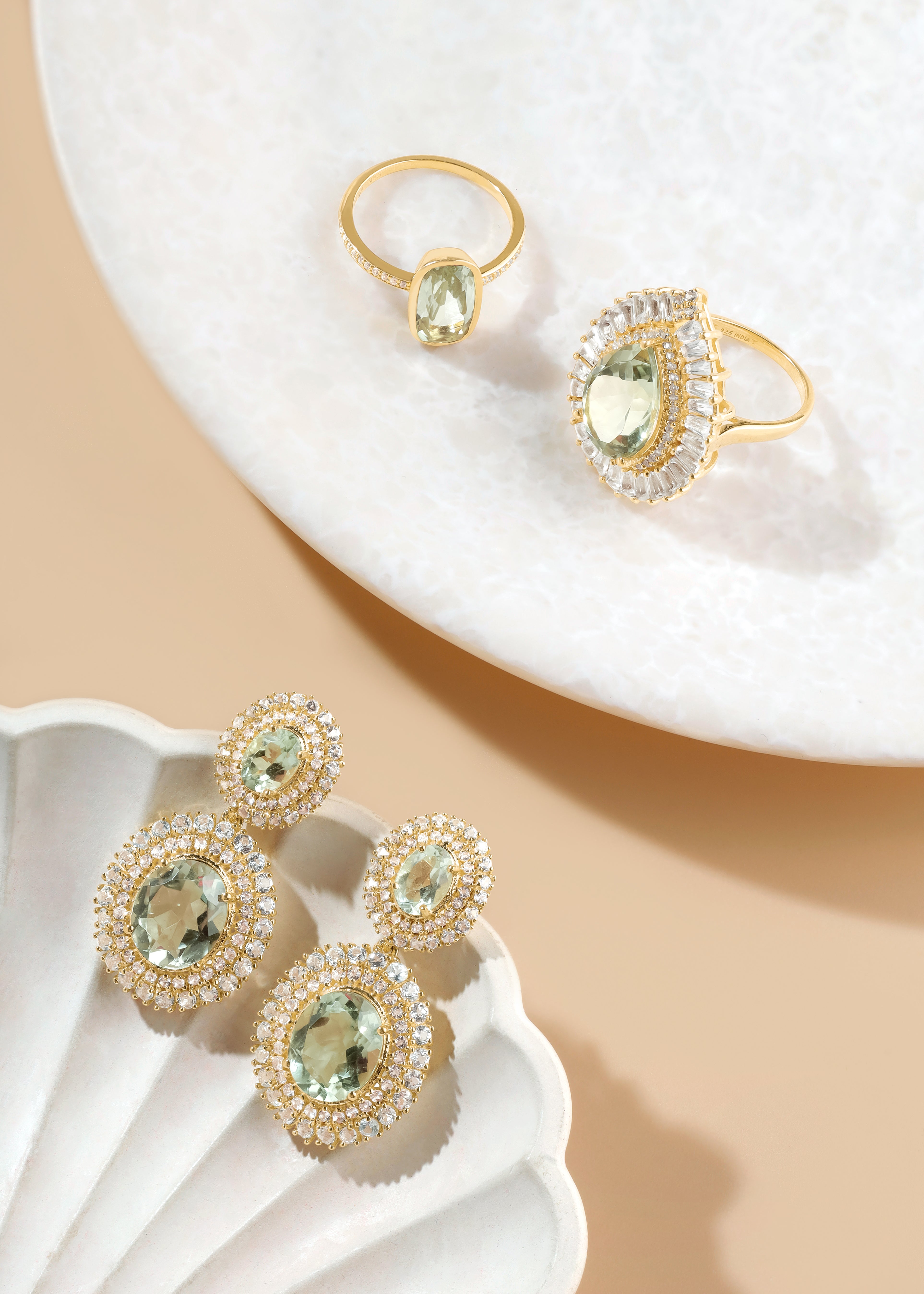 This stunning Green Amethyst ring exudes a refreshing, luminous elegance, beautifully haloed with sparkling White Topaz for a radiant finish. Set in 14K gold-plated 925 silver, it delivers a luxurious, statement-making sparkle perfect for both special moments and elevated everyday style.