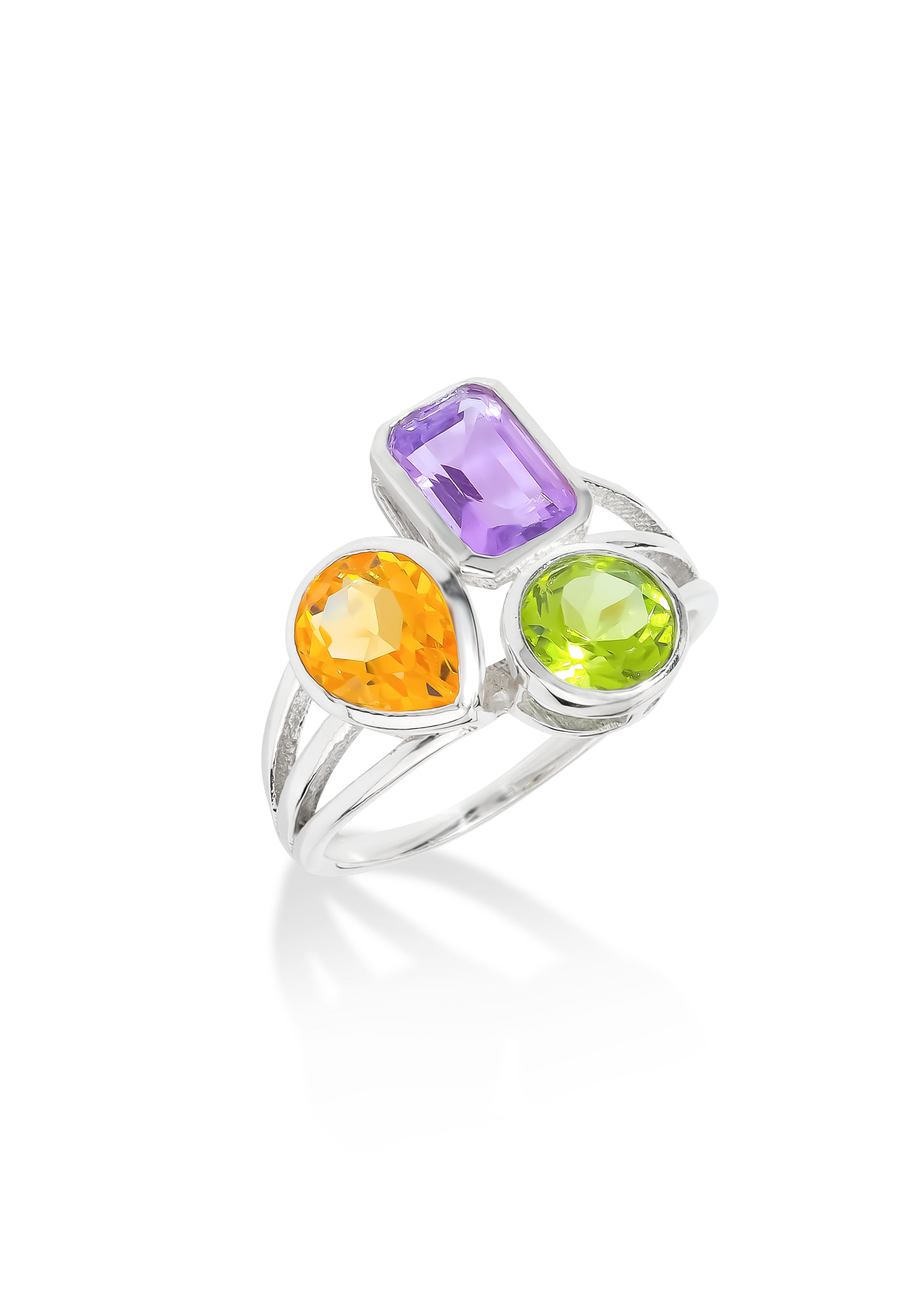 • Features Amethyst, Citrine, and Peridot in a vibrant, elegant arrangement.