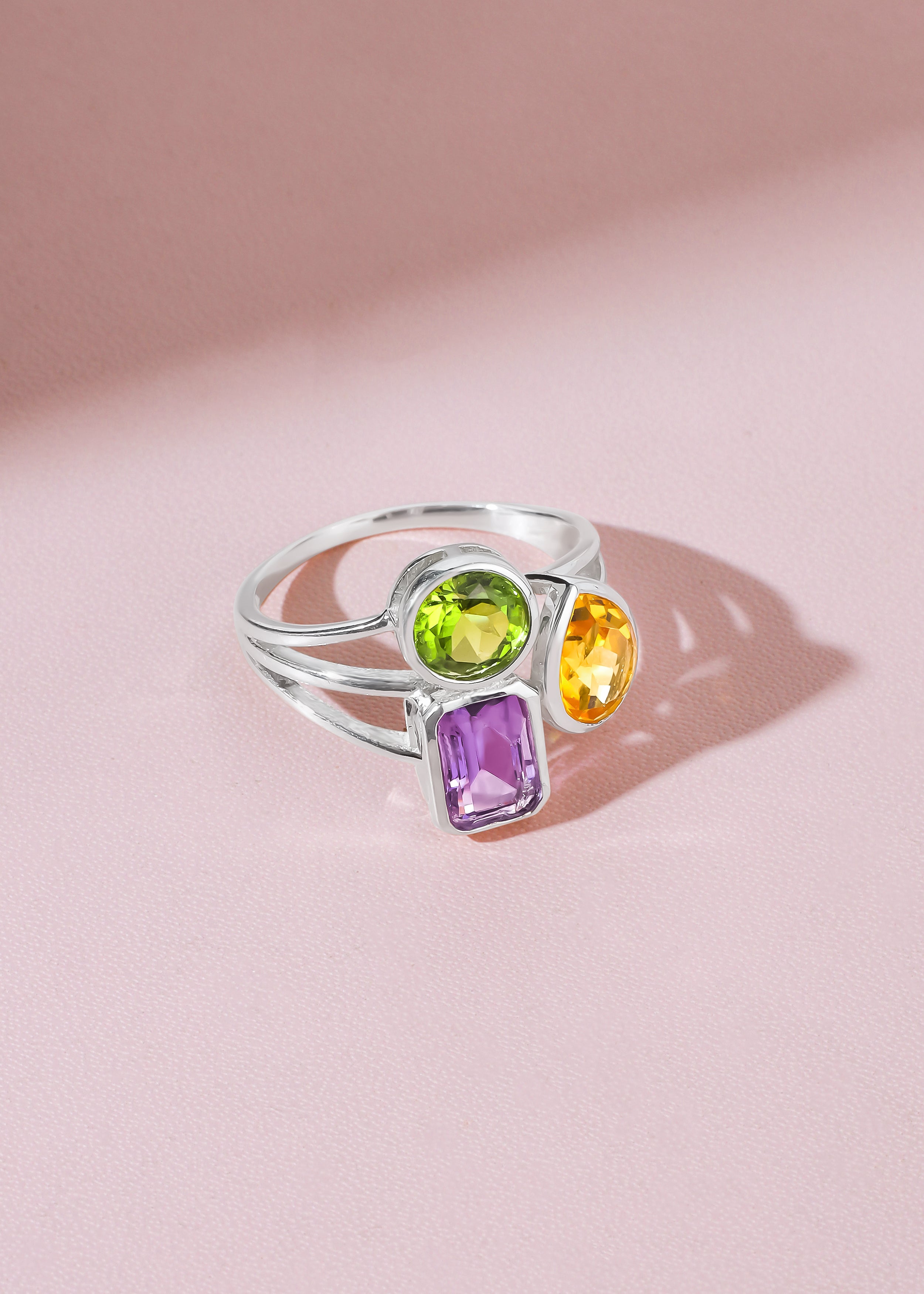 Add a pop of vibrant elegance to your jewelry collection with this beautifully crafted three stone ring in solid 925 sterling silver. Featuring a graceful combination of rich Amethyst, warm Citrine, and fresh green Peridot, this ring showcases a harmonious blend of color and brilliance. The classic three stone design offers timeless appeal while celebrating individuality and style. Perfect for everyday wear or special occasions, this gemstone ring brings a refined yet playful charm to any look.