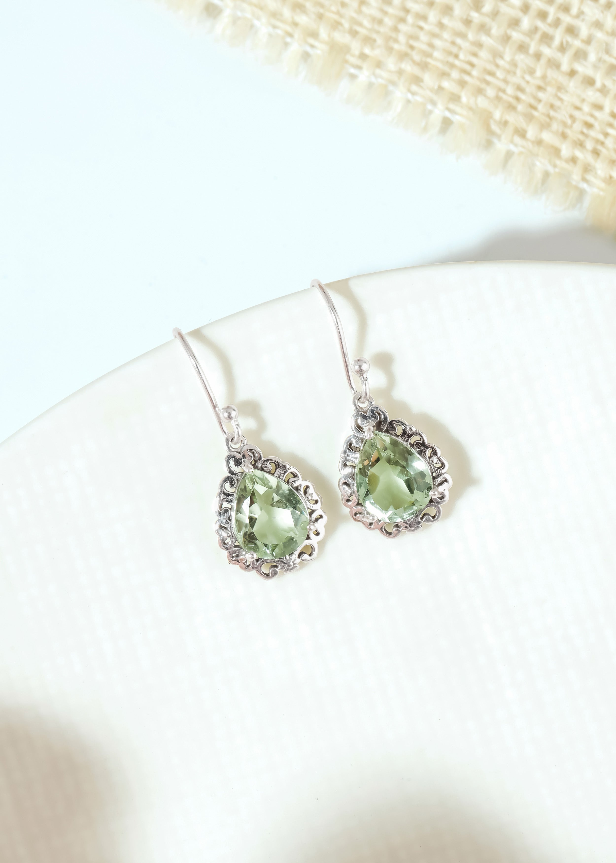 Elegant and softly luminous, these Green Amethyst Drop Earrings feature delicate pastel-green gemstones framed by ornate sterling silver detailing. The graceful teardrop silhouette and vintage-inspired metalwork create a refined, handcrafted look with gentle movement. These earrings add timeless charm and subtle color to both everyday wear and special occasions.